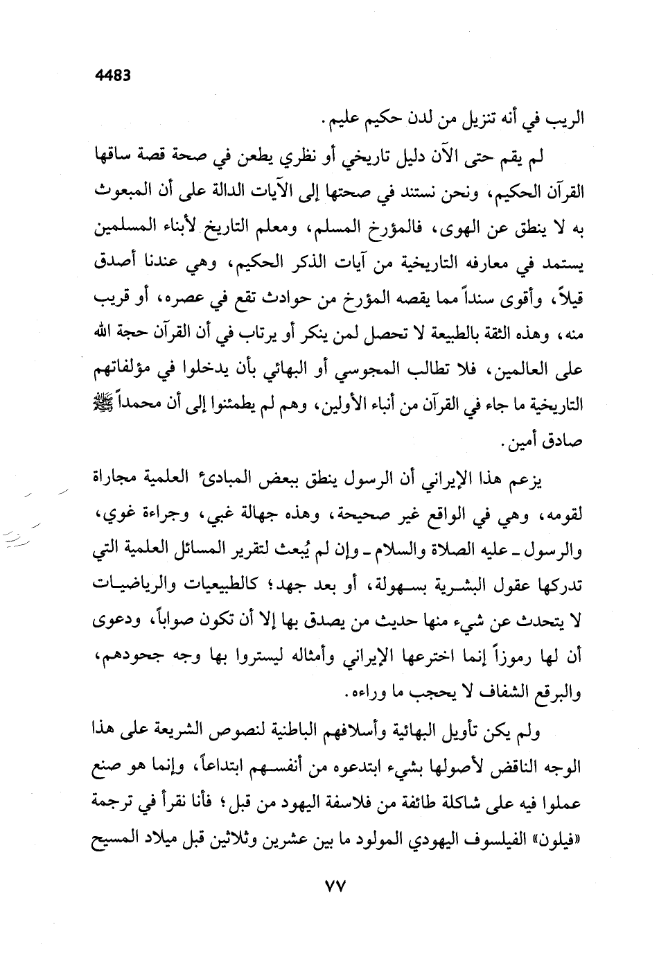 يزعم هذا الإيراني أن الرسول ينطق ببعض المبادئ العلمية مجاراة لقومه، وهي في الواقع غير صحيحة، وهذه جهالة غبي، وجراءة غوي، والرسول - عليه الصلاة والسلام - وإن لم يُبعث لتقرير المسائل العلمية التي تدركها عقول البشرية بسهولة، أو بعد جهد؛ كالطبيعيات والرياضيات لا يتحدث عن شيء منها حديث من يصدق بها إلا أن تكون صواباً، ودعوى أن لها رموزاً إنما اخترعها الإيراني وأمثاله ليستروا بها وجه جحودهم، والبرقع الشفاف لا يحجب ما وراءه.
