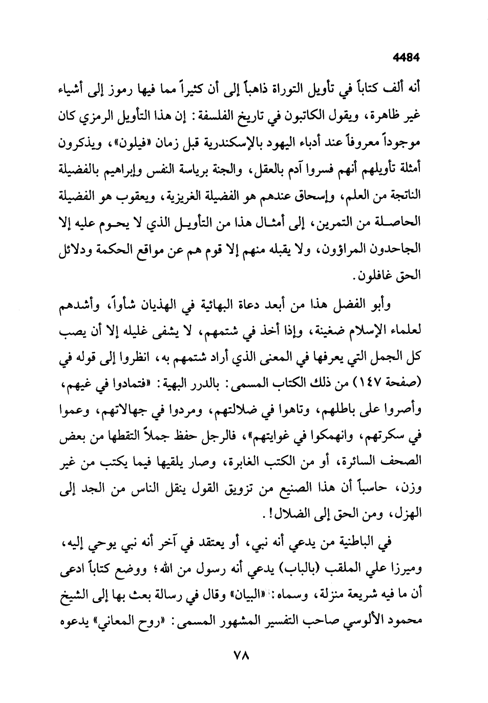 وأبو الفضل هذا من أبعد دعاة البهائية في الهذيان شأواً، وأشدهم لعلماء الإِسلام ضغينة، وإذا أخذ في شتمهم، لا يشفى غليله إلا أن يصب كل الجمل التي يعرفها في المعنى الذي أراد شتمهم به، انظروا إلى قوله في (صفحة 147) من ذلك الكتاب المسمى: بالدرر البهية: "فتمادوا في غيهم، وأصروا على باطلهم، وتاهوا في ضلالتهم، ومردوا في جهالاتهم، وعموا في سكرتهم، وانهمكوا في غوايتهم"، فالرجل حفظ جملاً التقطها من بعض الصحف السائرة، أو من الكتب الغابرة، وصار يلقيها فيما يكتب من غير وزن، حاسباً أن هذا الصنيع من تزويق القول ينقل الناس من الجد إلى الهزل، وكان الحق إلى الضلال!.