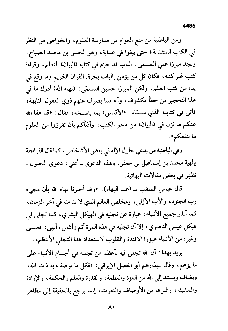 وفي الباطنية من يدعي حلول الإله في بعض الأشخاص، كما قال القرامطة بإلهية محمد بن إسماعيل بن جعفر، وهذه الدعوى -أعني: دعوى الحلول- تظهر في بعض مقالات البهائية.