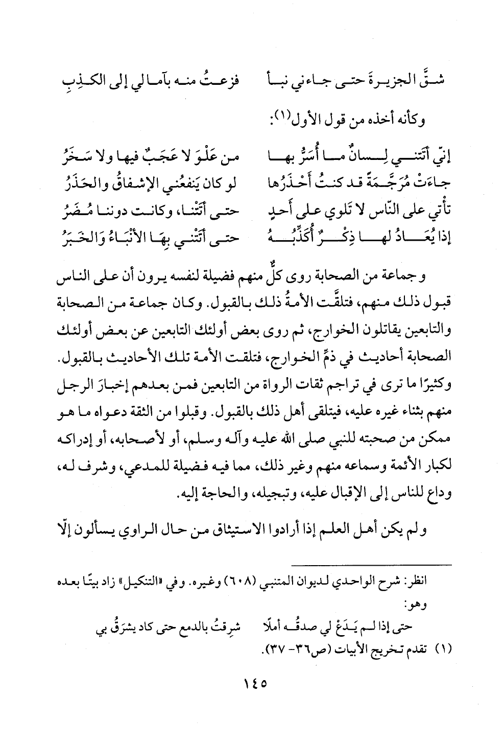 وجماعة من الصحابة روى كلٌّ منهم فضيلة لنفسه يرون أن على الناس قبول ذلك منهم، فتلقَّت الأمةُ ذلك بالقبول. وكان جماعة من الصحابة والتابعين يقاتلون الخوارج، ثم روى بعض أولئك التابعين عن بعض أولئك الصحابة أحاديث في ذمِّ الخوارج، فتلقت الأمة تلك الأحاديث بالقبول. وكثيرًا ما ترى في تراجم ثقات الرواة من التابعين فمن بعدهم إخبارَ الرجل منهم بثناء غيره عليه، فيتلقى أهل ذلك بالقبول. وقبلوا من الثقة دعواه ما هو ممكن من صحبته للنبي صلى الله عليه وآله وسلم، أو لأصحابه، أو إدراكه لكبار الأئمة وسماعه منهم وغير ذلك، مما فيه فضيلة للمدعي، وشرف له، وداع للناس إلى الإقبال عليه، وتبجيله، والحاجة إليه.