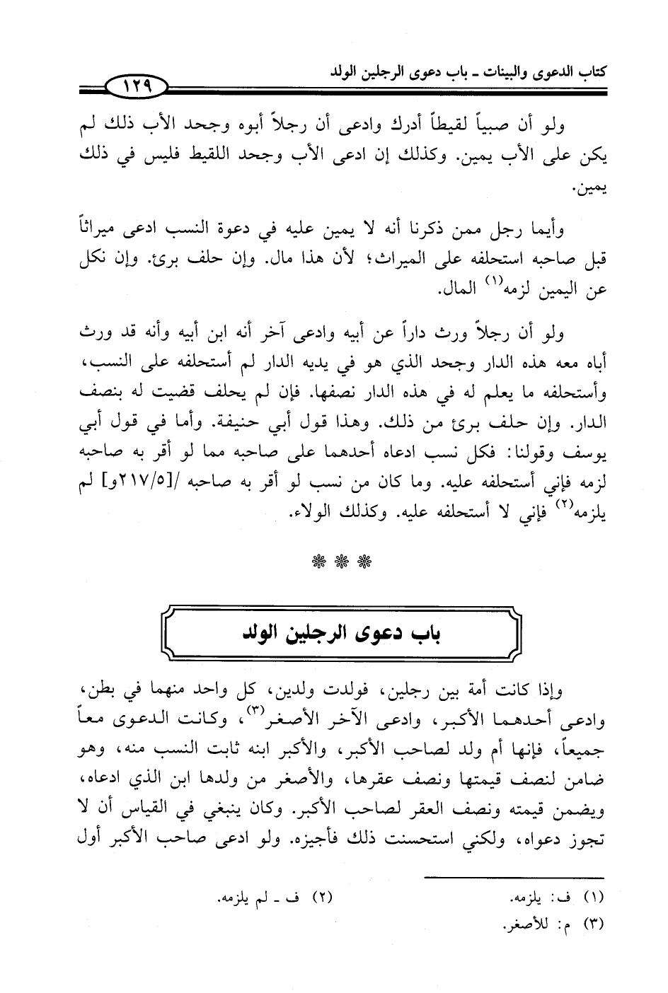 ولو أن رجلاً ورث داراً عن أبيه وادعى آخر أنه ابن أبيه وأنه قد ورث أباه معه هذه الدار وجحد الذي هو في يديه الدار لم أستحلفه على النسب، وأستحلفه ما يعلم له في هذه الدار نصفها. فإن لم يحلف قضيت له بنصف الدار. وإن حلف برئ من ذلك. وهذا قول أبي حنيفة. وأما في قول أبي يوسف وقولنا: فكل نسب ادعاه أحدهما على صاحبه مما لو أقر به صاحبه لزمه فإني أستحلفه عليه. وما كان من نسب لو أقر به صاحبه لم يلزمه (¬2) فإني لا أستحلفه عليه. وكذلك الولاء.
