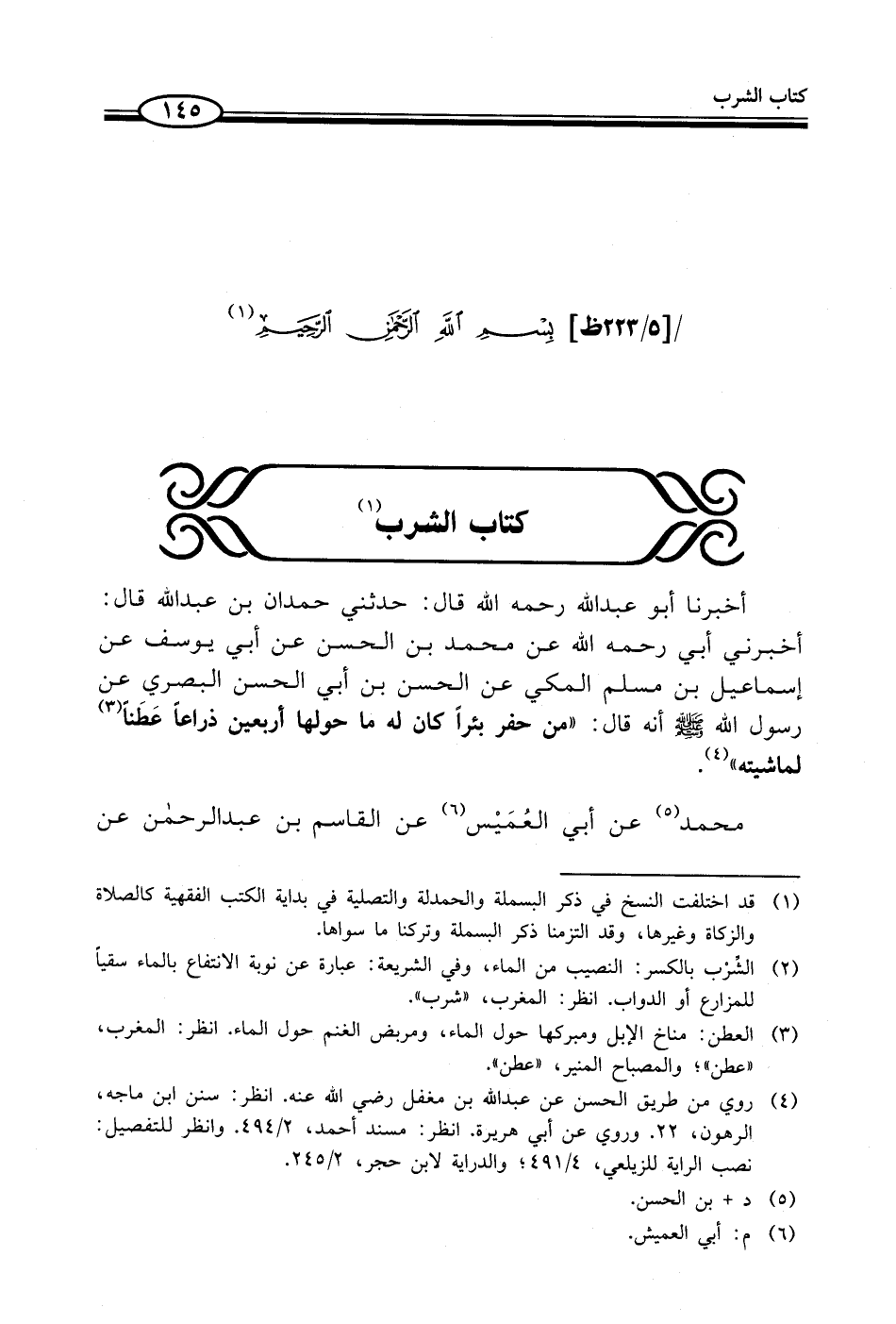 أخبرنا أبو عبد الله -رحمه الله- قال: حدثني حمدان بن عبد الله قال: أخبرني أبي -رحمه الله- عن محمد بن الحسن عن أبي يوسف عن إسماعيل بن مسلم المكي عن الحسن بن أبي الحسن البصري عن رسول الله - صلى الله عليه وسلم - أنه قال: "من حفر بئراً كان له ما حولها أربعين ذراعاً عَطَناً (¬3) لماشيته" (¬4).