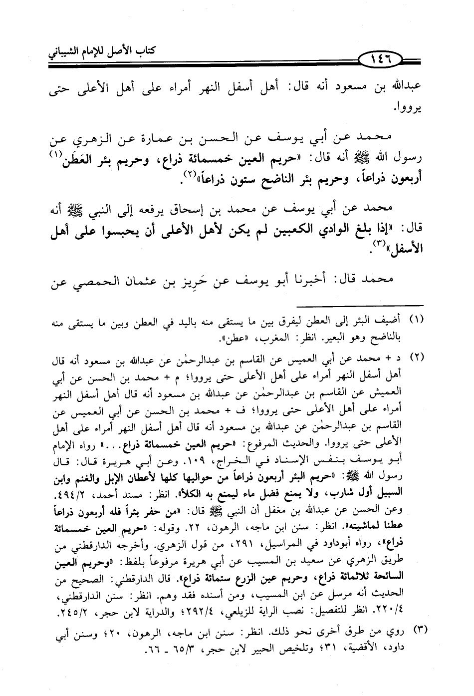 (¬2) د + محمد عن أبي العميس عن القاسم بن عبد الرحمن عن عبد الله بن مسعود أنه قال أهل أسفل النهر أمراء على أهل الأعلى حتى يرووا؛ م + محمد بن الحسن عن أبي العميش عن القاسم بن عبد الرحمن عن عبد الله بن مسعود أنه قال أهل أسفل النهر أمراء على أهل الأعلى حتى يرووا؛ ف + محمد بن الحسن عن أبي العميس عن القاسم بن عبد الرحمن عن عبد الله بن مسعود أنه قال أهل أسفل النهر أمراء على أهل الأعلى حتى يرووا. والحديث المرفوع: "حريم العين خمسمائة ذكل. . ." رواه الإمام أبو يوسف بنفس الإسناد في الخراج، 109. وعن أبي هريرة قال: قال رسول الله - صلى الله عليه وسلم -: "حريم البئر أربعون ذراعاً من حواليها كلها لأعطان الإبل والغنم وابن السبيل أول شارب، ولا يمنع فضل ماء ليمنع به الكلأ". انظر: مسند أحمد، 2/ 494. وعن الحسن عن عبد الله بن مغفل أن النبي - صلى الله عليه وسلم - قال: "من حفر بئراً فله أربعون ذراعاً عطنا لماشيته". انظر: سنن ابن ماجه، الرهون، 22. وقوله: "حريم العين خمسمائة ذراع"، رواه أبو داود في المراسيل، 291، من قول الزهري. وأخرجه الدارقطني من طريق الزهري عن سعيد بن المسيّب عن أبي هريرة مرفوعاً بلفظ: "وحريم العين السائحة ثلاثمائة ذراع، وحريم عين الزرع ستمائة ذراع". قال الدارقطني: الصحيح من الحديث أنه مرسل عن ابن المسيّب، ومن أسنده فقد وهم. انظر: سنن الدارقطني، 4/ 220. انظر للتفصيل: نصب الراية للزيلعي، 4/ 292؛ والدراية لابن حجر، 2/ 245.