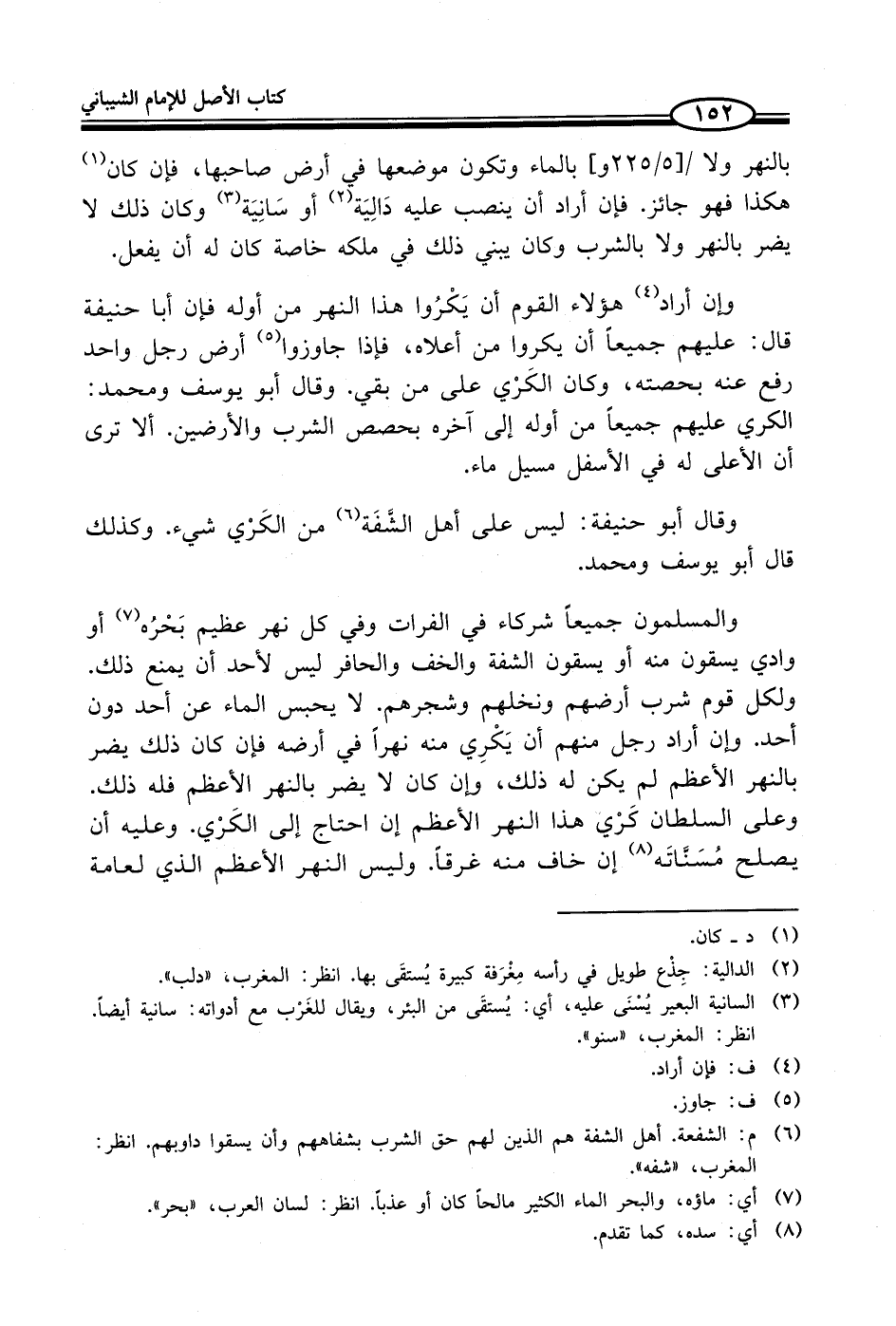 والمسلمون جميعاً شركاء في الفرات وفي كل نهر عظيم بَحْرُه (¬7) أو وادي يسقون منه أو يسقون الشفة والخف والحافر ليس لأحد أن يمنع ذلك. ولكل قوم شرب أرضهم ونخلهم وشجرهم. لا يحبس الماء عن أحد دون أحد. وإن أراد رجل منهم أن يَكْرِي منه نهراً في أرضه فإن كان ذلك يضر بالنهر الأعظم لم يكن له ذلك، وإن كان لا يضر بالنهر الأعظم فله ذلك. وعلى السلطان كَرْي هذا النهر الأعظم إن احتاج إلى الكَرْي. وعليه أن يصلح مُسَنَّاتَه (¬8) إن خاف منه غرقاً. وليس النهر الأعظم الذي لعامة
