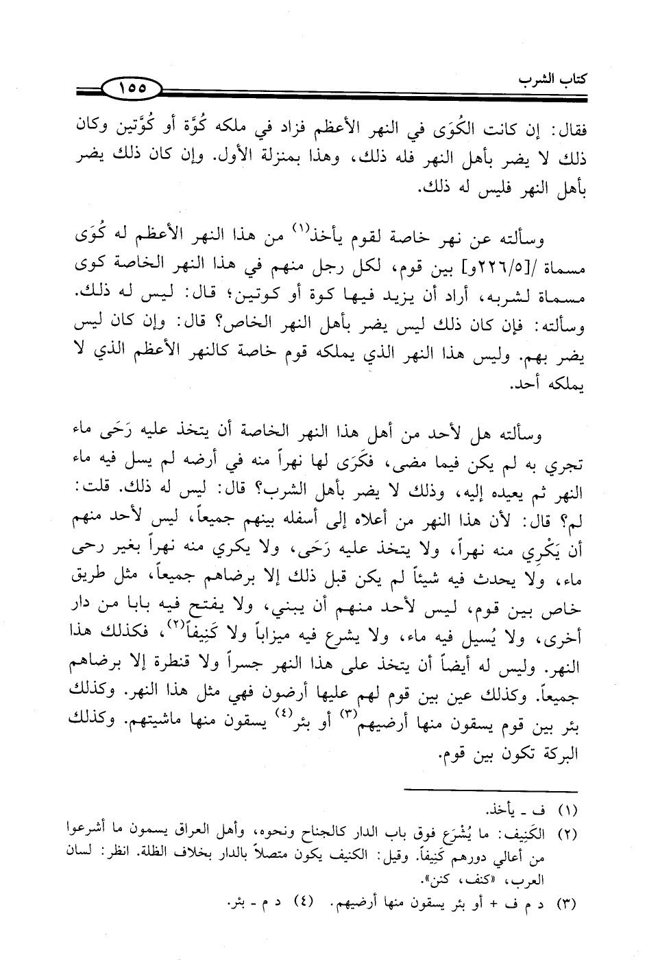 وسألته هل لأحد من أهل هذا النهر الخاصة أن يتخذ عليه رَحَى ماء تجري به لم يكن فيما مضى، فكَرَى لها نهراً منه في أرضه لم يسل فيه ماء النهر ثم يعيده إليه، وذلك لا يضر بأهل الشرب؛ قال: ليس له ذلك. قلت: لم؟ قال: لأن هذا النهر من أعلاه إلى أسفله بينهم جميعاً، ليس لأحد منهم أن يَكْرِي منه نهراً، ولا يتخذ عليه رَحَى، ولا يكري منه نهراً بغير رحى ماء، ولا يحدث فيه شيئاً لم يكن قبل ذلك إلا برضاهم جميعاً، مثل طريق خاص بين قوم، ليس لأحد منهم أن يبني، ولا يفتح فيه بابا من دار أخرى، ولا يُسيل فيه ماء، ولا يشرع فيه ميزاباً ولا كَنِيفاً (¬2)، فكذلك هذا النهر. وليس له أيضاً أن يتخذ على هذا النهر جسراً ولا قنطرة إلا برضاهم جميعاً. وكذلك عين بين قوم لهم عليها أرضون فهي مثل هذا النهر. وكذلك بئر بين قوم يسقون منها أرضيهم (¬3) أو بئر (¬4) يسقون منها ماشيتهم. وكذلك البركة تكون بين قوم.