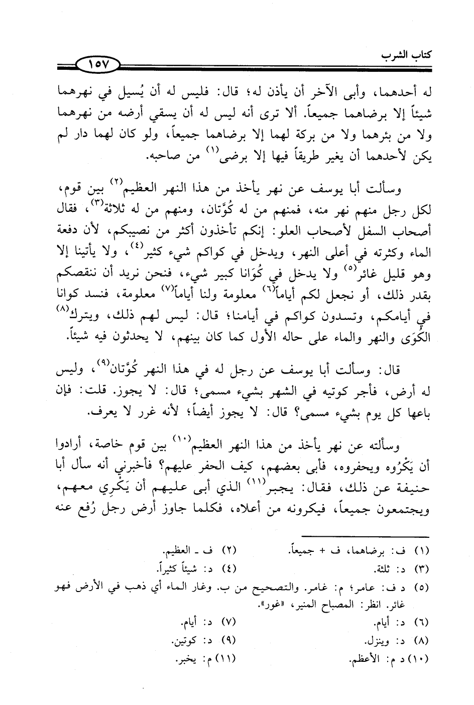 وسألت أبا يوسف عن نهر يأخذ من هذا النهر العظيم (¬2) بين قوم، لكل رجل منهم نهر منه، فمنهم من له كُوَّتان، ومنهم من له ثلاثة (¬3)، فقال أصحاب السفل لأصحاب العلو: إنكم تأخذون أكثر من نصيبكم؛ لأن دفعة الماء وكثرته في أعلى النهر، ويدخل في كواكم شيء كثير (¬4)، ولا يأتينا إلا وهو قليل غائر (¬5) ولا يدخل في كُوَانا كبير شيء، فنحن نريد أن ننقصكم بقدر ذلك، أو نجعل لكم أياماً (¬6) معلومة ولنا أياماً (¬7) معلومة، فنسد كوانا في أيامكم، وتسدون كواكم في أيامنا؛ قال: ليس لهم ذلك، ويترك (¬8) الكُوَى والنهر والماء على حاله الأول كما كان بينهم، لا يحدثون فيه شيئاً.