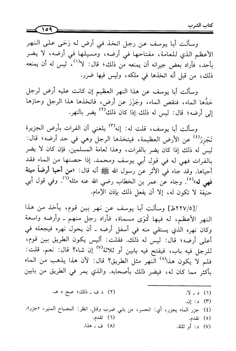 وسألت أبا يوسف عن هذا النهر العظيم إن كانت عليه أرض لرجل حَدُّها الماء، فنقص الماء، وجَزَرَ عن أرض، فاتخذها هذا الرجل وحازها إلى أرضه، قال: ليس له ذلك إذا كان ذلك (¬2) يضر بالنهر.