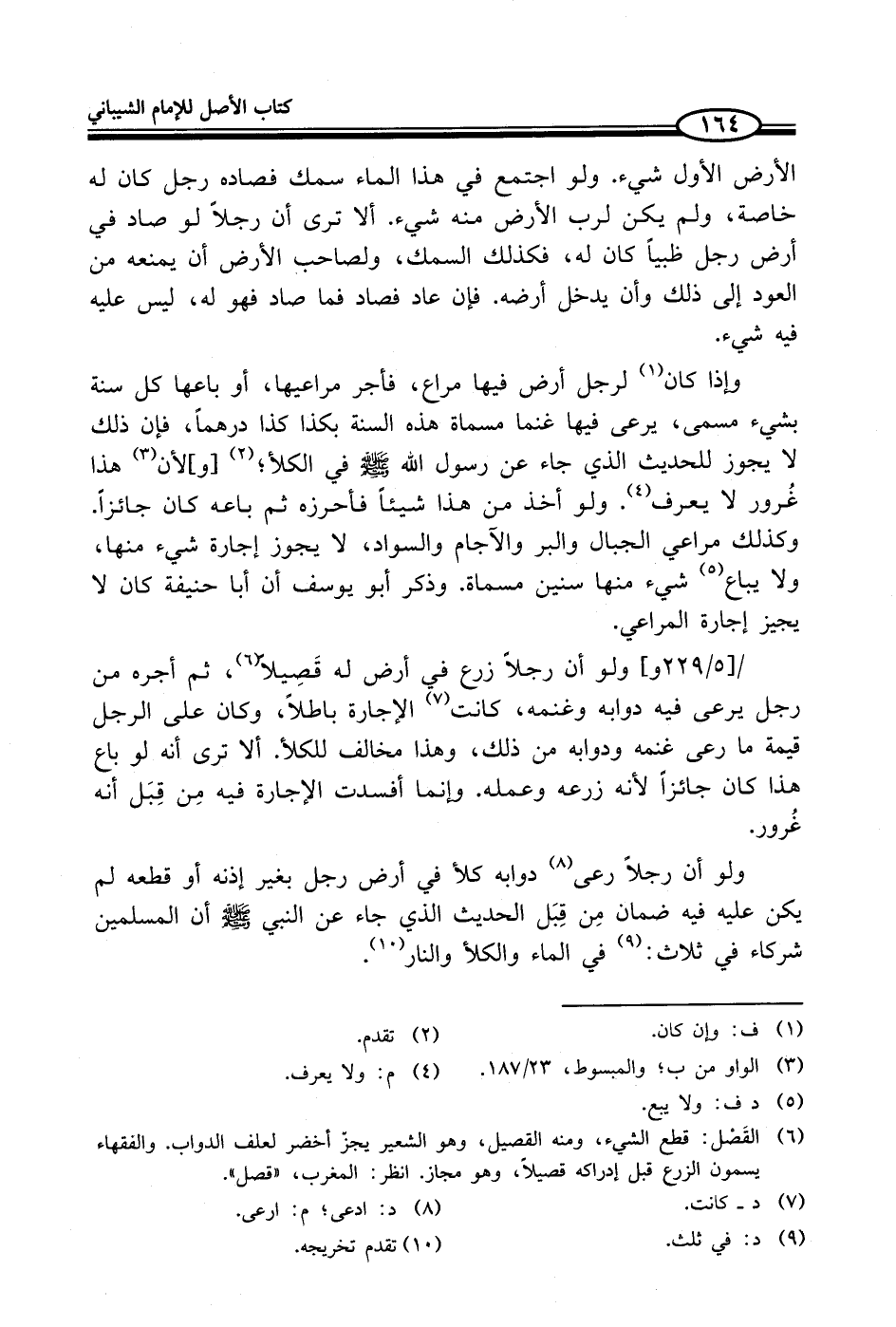 ولو أن رجلاً رعى (¬8) دوابه كلأ في أرض رجل بغير إذنه أو قطعه لم يكن عليه فيه ضمان مِن قِبَل الحديث الذي جاء عن النبي - صلى الله عليه وسلم - أن المسلمين شركاء في ثلاث: (¬9) في الماء والكلأ والنار (¬10).