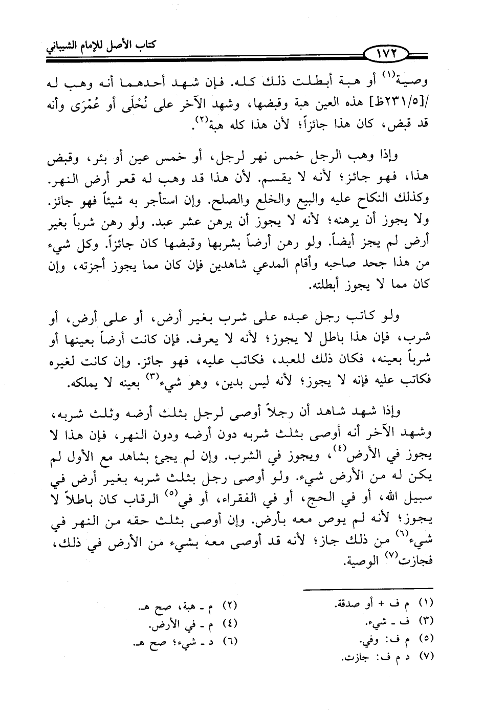 وإذا شهد شاهد أن رجلاً أوصى لرجل بثلث أرضه وثلث شربه، وشهد الآخر أنه أوصى بثلث شربه دون أرضه ودون النهر، فإن هذا لا يجوز في الأرض (¬4)، ويجوز في الشرب. كان لم يجئ بشاهد مع الأول لم يكن له من الأرض شيء. ولو أوصى رجل بثلث شربه بغير أرض في سبيل الله، أو في الحج، أو في الفقراء، أو في (¬5) الرقاب كان باطلاً لا يجوز؛ لأنه لم يوص معه بأرض. وإن أوصى بثلث حقه من النهر في شيء (¬6) من ذلك جاز؛ لأنه قد أوصى معه بشيء من الأرض في ذلك،