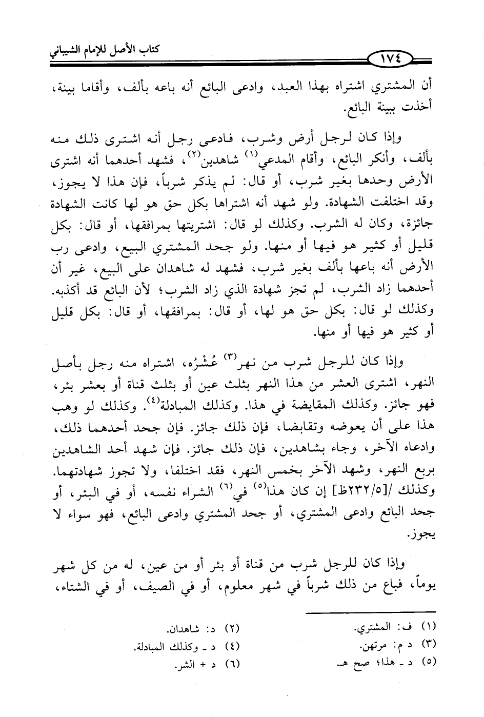 وإذا كان للرجل شرب من نهر (¬3) عُشْرُه، اشتراه منه رجل بأصل النهر، اشترى العشر من هذا النهر بثلث عين أو بثلث قناة أو بعشر بئر، فهو جائز. وكذلك المقايضة في هذا. وكذلك المبادلة (¬4). وكذلك لو وهب هذا على أن يعوضه وتقابضا، فإن ذلك جائز. فإن جحد أحدهما ذلك، وادعاه الآخر، وجاء بشاهدين، فإن ذلك جائز. فإن شهد أحد الشاهدين بربع النهر، وشهد الآخر بخمس النهر، فقد اختلفا، ولا تجوز شهادتهما. وكذلك إن كان هذا (¬5) في (¬6) الشراء نفسه، أو في البئر، أو جحد البائع وادعى المشتري، أو جحد المشتري وادعى البائع، فهو سواء لا يجوز.