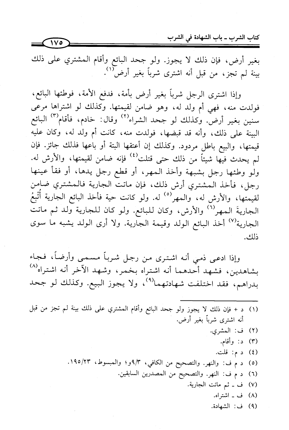 وإذا ادعى ذمي أنه اشترى من رجل شرباً مسمى وأرضاً، فجاء بشاهدين، فشهد أحدهما أنه اشتراه بخمر، وشهد الآخر أنه اشتراه (¬8) بدراهم، فقد اختلفت شهادتهما (¬9)، ولا يجوز البيع. وكذلك لو جحد