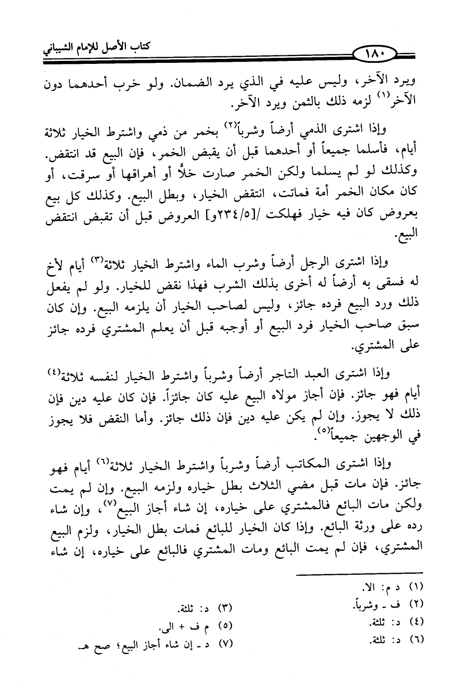 وإذا اشترى الذمي أرضاً وشرباً (¬2) بخمر من ذمي واشترط الخيار ثلاثة أيام، فأسلما جميعاً أو أحدهما قبل أن يقبض الخمر، فإن البيع قد انتقض. وكذلك لو لم يسلما ولكن الخمر صارت خلًّا أو أهراقها أو سرقت، أو كان مكان الخمر أمة فماتت، انتقض الخيار، وبطل البيع. وكذلك كل بيع بعروض كان فيه خيار فهلكت العروض قبل أن تقبض انتقض البيع.