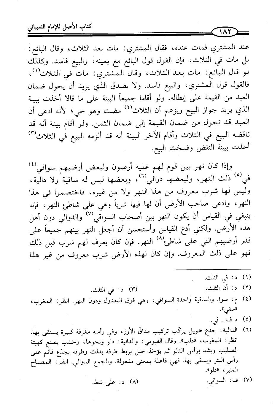 وإذا كان نهر بين قوم لهم عليه أرضون ولبعض أرضيهم سواقي (¬4) في (¬5) ذلك النهر، ولبعضها دوالي (¬6)، وبعضها ليس له ساقية ولا دالية، وليس لها شرب معروف من هذا النهر ولا من غيره، فاختصموا في هذا النهر، وادعى صاحب الأرض أن لها فيها شرباً وهي على شاطئ النهر، فإنه ينبغي في القياس أن يكون النهر بين أصحاب السواقي (¬7) والدوالي دون أهل هذه الأرض. ولكني أح القياس وأستحسن أن أجعل النهر بينهم جميعاً على قدر أرضيهم التي على شاطئ (¬8) النهر. فإن كان يعرف لهم شرب قبل ذلك فهو على ذلك المعروف. كان كان لهذه الأرض شرب معروف من غير هذا