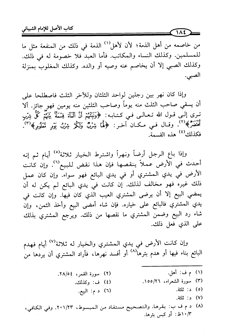 وإذا كان نهر بين رجلين لواحد الثلثان وللآخر الثلث فاصطلحا على أن يسقي صاحب الثلث منه يوماً وصاحب الثلثين منه يومين فهوجائز. ألا ترى إلى قول الله تعالى في كتابه: {وَنَبِّئْهُمْ أَنَّ الْمَاءَ قِسْمَةٌ بَيْنَهُمْ كُلُّ شِرْبٍ مُحْتَضَرٌ} (¬2). وقال في مكان آخر: {لَهَا شِرْبٌ وَلَكُمْ شِرْبُ يَوْمٍ مَعْلُومٍ} (¬3). فكذلك (¬4) هذه القسمة.