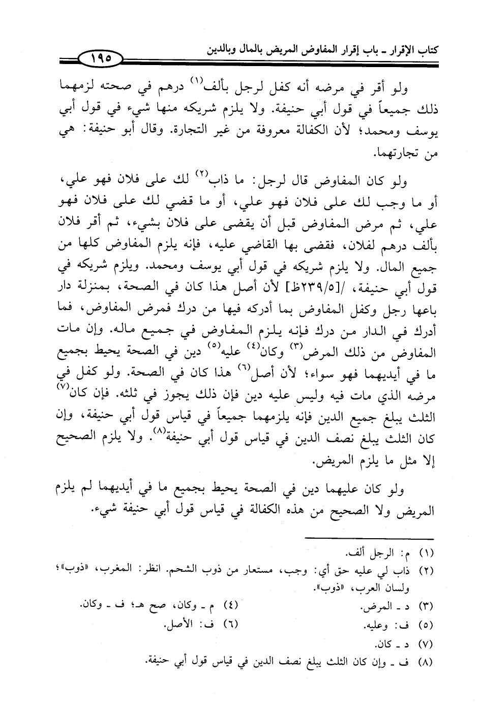 ولو كان المفاوض قال لرجل: ما ذاب (¬2) لك على فلان فهو علي، أو ما وجب لك على فلان فهو علي، أو ما قضي لك على فلان فهو علي، ثم مرض المفاوض قبل أن يقضى على فلان بشيء، ثم أقر فلان بألف درهم لفلان، فقضى بها القاضي عليه، فإنه يلزم المفاوض كلها من جميع المال. ولا يلزم شريكه في قول أبي يوسف ومحمد. ويلزم شريكه في قول أبي حنيفة، لأن أصل هذا كان في الصحة، بمنزلة دار باعها رجل وكفل المفاوض بما أدركه فيها من درك فمرض المفاوض، فما أدرك في الدار من درك فإنه يلزم المفاوض في جميع ماله. وإن مات المفاوض من ذلك المرض (¬3) وكان (¬4) عليه (¬5) دين في الصحة يحيط بجميع ما في أيديهما فهو سواء؛ لأن أصل (¬6) هذا كان في الصحة. ولو كفل في مرضه الذي مات فيه وليس عليه دين فإن ذلك يجوز في ثلثه. فإن كان (¬7) الثلث يبلغ جميع الدين فإنه يلزمهما جميعاً في قياس قول أبي حنيفة، وإن كان الثلث يبلغ نصف الدين في قياس قول أبي حنيفة (¬8). ولا يلزم الصحيح إلا مثل ما يلزم المريض.