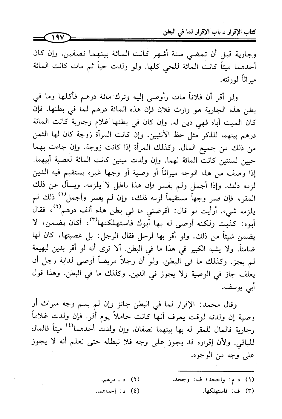 وقال محمد: الإقرار لما في البطن جائز وإن لم يسم وجه ميراث أو وصية إن ولدته لوقت يعرف أنها كانت حاملاً يوم أقر. فإن ولدت غلاماً وجارية فالمال للمقر له بها بينهما نصفان. كان ولدت أحدهما (¬4) ميتاً فالمال للباقي. ولأن إقراره قد يجوز على وجه فلا نبطله حتى نعلم أنه لا يجوز على وجه من الوجوه.