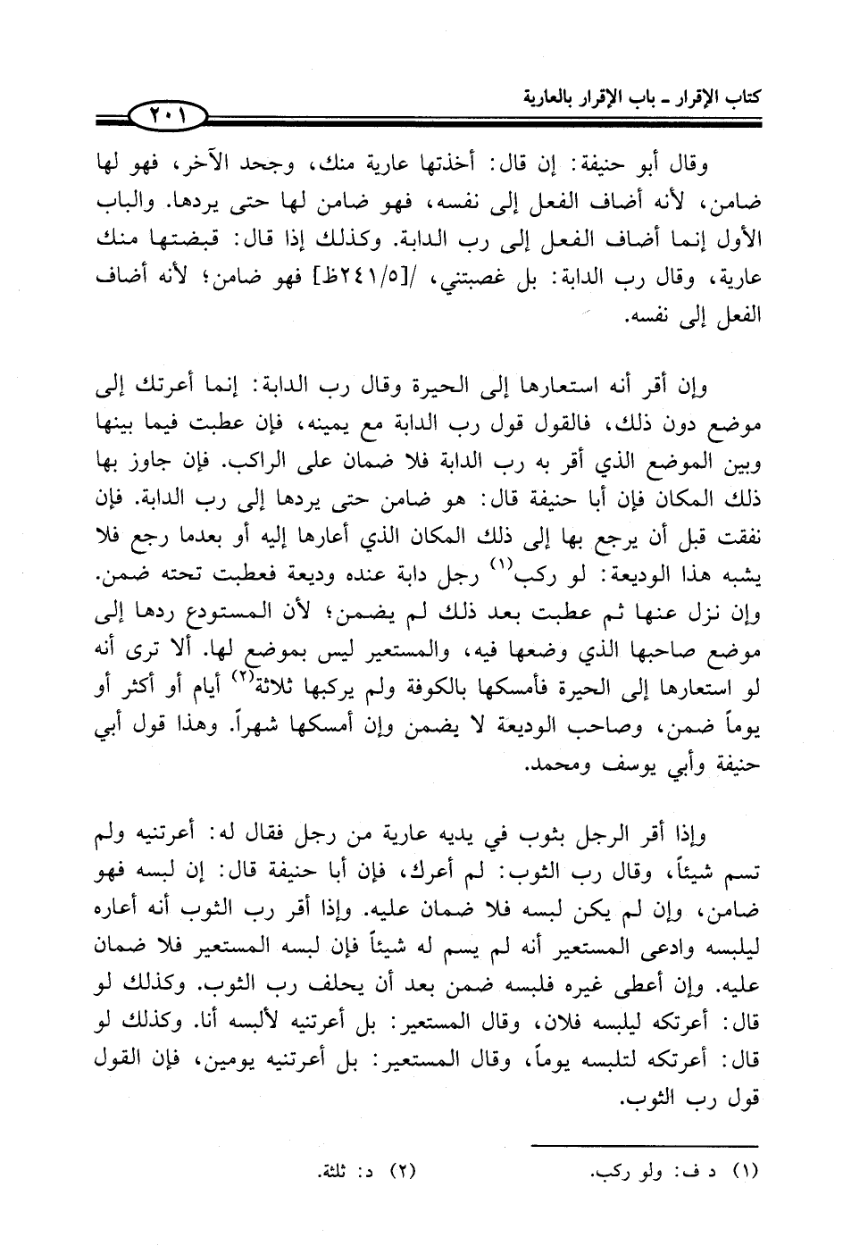 وإن أقر أنه استعارها إلى الحيرة وقال رب الدابة: إنما أعرتك إلى موضع دون ذلك، فالقول قول رب الدابة مع يمينه، فإن عطبت فيما بينها وبين الموضع الذي أقر به رب الدابة فلا ضمان على الراكب. فإن جاوز بها ذلك المكان فإن أبا حنيفة قال: هو ضامن حتى يردها إلى رب الدابة. فإن نفقت قبل أن يرجع بها إلى ذلك المكان الذي أعارها إليه أو بعدما رجع فلا يشبه هذا الوديعة: لو ركب (¬1) رجل دابة عنده وديعة فعطبت تحته ضمن. وإن نزل عنها ثم عطبت بعد ذلك لم يضمن؛ لأن المستودع ردها إلى موضع صاحبها الذي وضعها فيه، والمستعير ليس بموضع لها. ألا ترى أنه لو استعارها إلى الحيرة فأمسكها بالكوفة ولم يركبها ثلاثة (¬2) أيام أو أكثر أو يوماً ضمن، وصاحب الوديعة لا يضمن كان أمسكها شهراً. وهذا قول أبي حنيفة وأبي يوسف ومحمد.