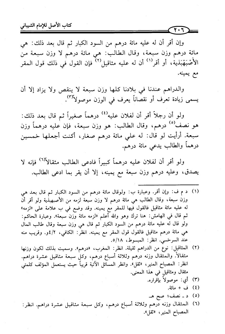 (¬2) المثاقيل: نوع من الدراهم ثقيلة. انظر: المغرب، "درهم". وشت بذلك لكون وزبها مثقالاً. والمثقال وزنه درهم وثلاثة أسباع درهم، وكل سبعة مثاقيل عشرة دراهم. انظر: المصباح المنير، "ثقل". وانظر المسائل الآتية قريباً حيث يستعمل المؤلف كلمتي مثقال ومثاقيل في هذا المعنى.
