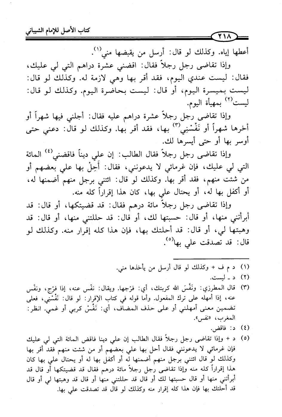 (¬5) د + وإذا تقاضى رجل رجلاً فقال الطالب إن علي دينا فاقض المائة التي في عليك فإن غرمائي لا يدعونني فقال أحل بها علي بعضهم أو من شئت منهم فقد أقر بها وكذلك لو قال ائتني برجل منهم أضمنها له أو أكفل بها له أو يحتال علي بها كان هذا إقراراً كله منه وإذا تقاضى رجل رجلاً مائة درهم فقال قد قضيتكها أو قال قد أبرأتني منها أو قال حسبتها لك أو قال قد حللتني منها أو قال قد وهبتها لي أو قال قد أحلتك بها فإن هذا كله إقرار منه وكذلك لو قال قد تصدقت علي بها.