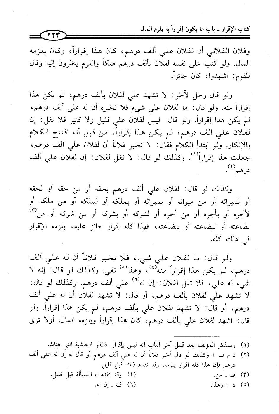 وفلان الفلاني أن لفلان علي ألف درهم، كان هذا إقراراً، وكان يلزمه المال. ولو كتب على نفسه لفلان بألف درهم صكاً والقوم ينظرون إليه وقال للقوم: اشهدوا، كان جائزاً.