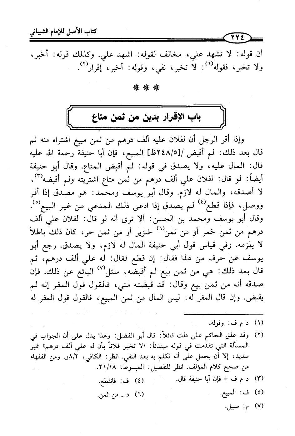 (¬2) وقد علق الحاكم على ذلك قائلاً: فال أبو الفضل: وهذا يدل على أن الجواب في المسألة التي تقدمت في قوله مبتدئاَ: "لا تخبر فلاناً بأن له علي ألف درهم" غير سديد + إلا أن يحمل على أنه تكلم به بعد النفي. انظر: الكافي، 2/ 8 و. ومن الفقهاء من صحيح كلام المؤلف. انظر للتفصيل: المبسوط، 18/ 21.