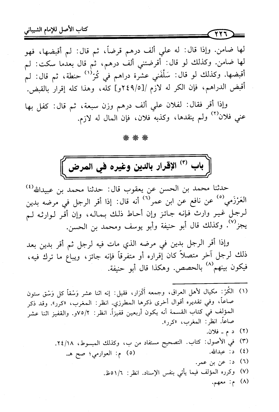 (¬1) الكُرّ: مكيال لأهل العراق، وجمعه أَكْرَار، فقيل: إنه اثنا عشر وَسْقاً كل وَسْق ستون صاعاً، وفي تقديره أقوال أخرى ذكرها المطرزي. انظر: المغرب، "كرر". وقد ذكر المؤلف في كتاب القسمة أنه يكون أربعين قفيزاً. انظر: 2/ 75 و. والقفيز اثنا عشر صاعاً. انظر: المغرب، "كرر".