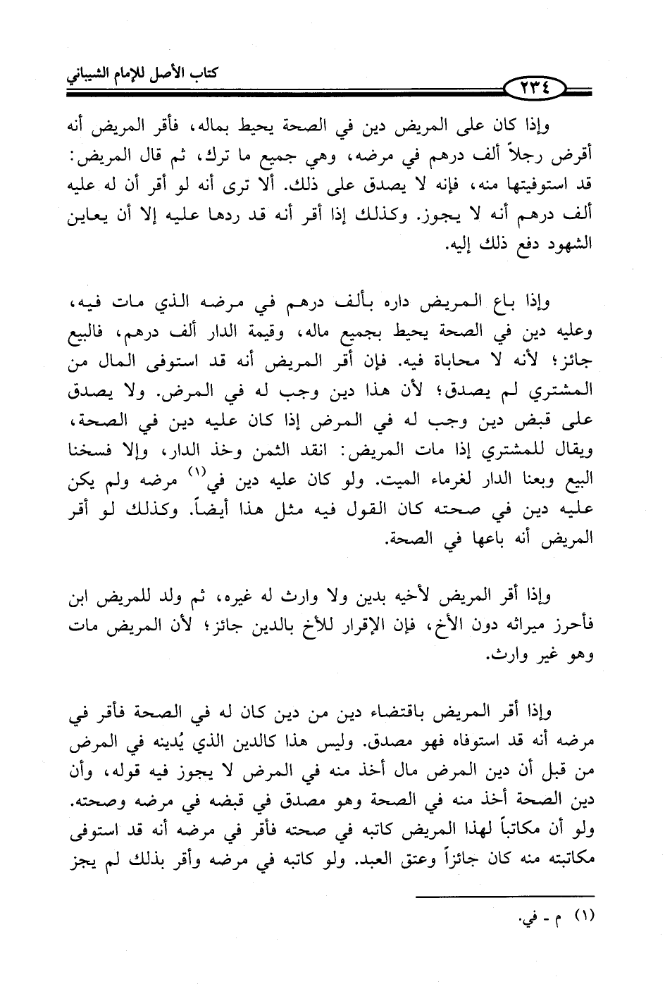 وإذا باع المريض داره بألف درهم في مرضه الذي مات فيه، وعليه دين في الصحة يحيط بجميع ماله، وقيمة الدار ألف درهم، فالبيع جائز؛ لأنه لا محاباة فيه. فإن أقر المريض أنه قد استوفى المال من المشتري لم يصدق؛ لأن هذا دين وجب له في المرض. ولا يصدق على قبض دين وجب له في المرض إذا كان عليه دين في الصحة، ويقال للمشتري إذا مات المريض: انقد الثمن وخذ الدار، وإلا فسخنا البيع وبعنا الدار لغرماء الميت. ولو كان عليه دين في (¬1) مرضه ولم يكن عليه دين في صحته كان القول فيه مثل هذا أيضاً. وكذلك لو أقر المريض أنه باعها في الصحة.
