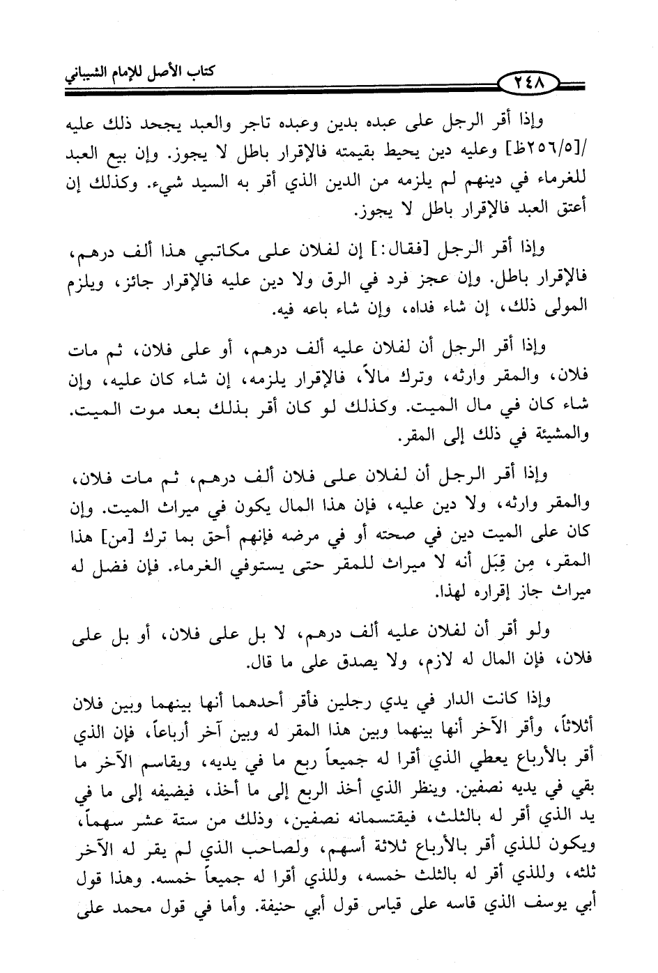 وإذا كانت الدار في يدي رجلين فأقر أحدهما أنها بينهما وبين فلان أثلاثاً، وأقر الآخر أنها بينهما وبين هذا المقر له وبين آخر أرباعاً، فإن الذي أقر بالأرباع يعطي الذي أقرا له جميعاً ربع ما في يديه، ويقاسم الآخر ما بقي في يديه نصفين. وينظر الذي أخذ الربع إلى ما أخذ، فيضيفه إلى ما في يد الذي أقر له بالثلث، فيقتسمانه نصفين، وذلك من ستة عشر سهماً، ويكون للذي أقر بالأرباع ثلاثة أسهم، ولصاحب الذي لم يقر له الآخر ثلثه، وللذي أقر له بالثلث خمسه، وللذي أقرا له جميعاً خصسه. وهذا قول أبي يوسف الذي قاسمه على قياس قول أبي حنيفة. وأما في قول محمد على