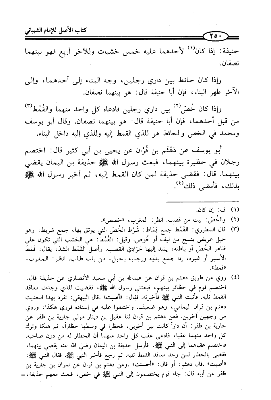 (¬4) روي من طريق دهثم بن قران عن عبد الله بن أبي سعيد الأنصاري عن حذيفة قال: اختصم قوم في حظائر بينهم، فبعثني رسول الله - صلى الله عليه وسلم -، فقضيت للذي وجدت معاقد القمط تليه. فأتيت النبي - صلى الله عليه وسلم - فأخبرته. فقال: "أصبت". قال البيهقي: تفرد بهذا الحديث دهثم بن قران اليمامي، وهو ضعيف. واختلفوا عليه في إسناده فروي هكذا، وروي من وجهين آخرين. فعن دهثم بن قران ثنا عقيل بن دينار مولى جارية بن ظفر عن جارية بن ظفر: أن دارأ كانت بين أخوين، فحظرا في وسطها حظاراً، ثم هلكا وترك كل واحد منهما عقبا، فادعى عقب كل واحد منهما أن الحظار له من دون صاحبه. فاختصم عقباهما إلى النبي - صلى الله عليه وسلم -، فأرسل حذيفة بن اليمان - رضي الله عنه - يقضي بينهما، فقضى بالحظار لمن وجد معاقد القمط تليمى ثم رجع فأخبر النبي - صلى الله عليه وسلم -. فقال النبي - صلى الله عليه وسلم -: "أصبت". قال دهثم: أو قال: "أحسنت". وعن دهثم بن قران عن نمران بن جارية بن ظفر عن أبيه قال: جاء قوم يختصمون إلى النبي - صلى الله عليه وسلم - في خص، فبعث معهم حذيفة،=