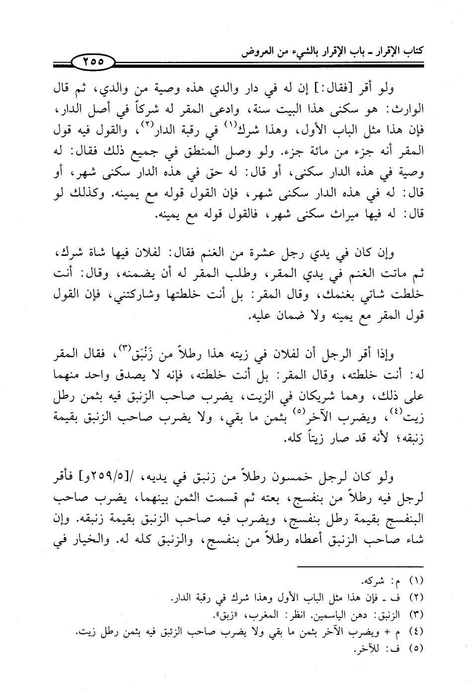 وإذا أقر الرجل أن لفلان في زيته هذا رطلاً من زَنْبَق (¬3)، فقال المقر له: أنت خلطته، وقال المقر: بل أنت خلطته، فإنه لا يصدق واحد منهما على ذلك، وهما شريكان في الزيت، يضرب صاحب الزنبق فيه بثمن رطل (¬4) زيت، ويضرب الآخر (¬5) بثمن ما بقي، ولا يضرب صاحب الزنبق بقيمه زنبقه؛ لأنه قد صار زيتاً كله.
