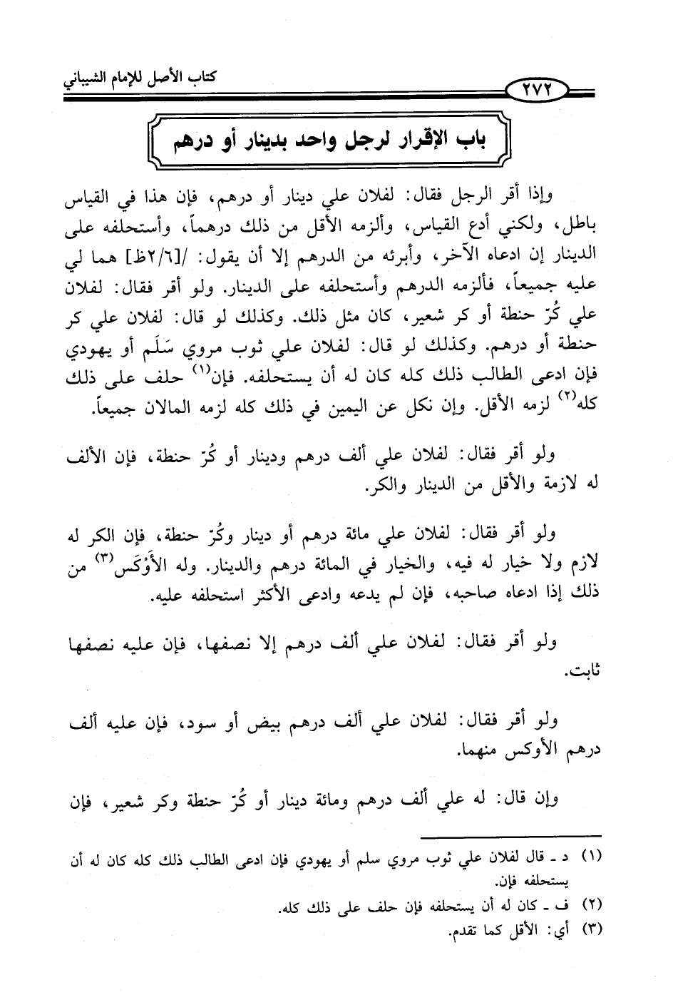 وإذا أقر الرجل فقال: لفلان علي دينار أو درهم، فإن هذا في القياس باطل، ولكني أدع القياس، وألزمه الأقل من ذلك درهماً، وأستحلفه على الدينار إن ادعاه الآخر، وأبرئه من الدرهم إلا أن يقول: هما في عليه جميعاً، فألزمه الدرهم وأستحلفه على الدينار. ولو أقر فقال: لفلان علي كُرّ حنطة أو كر شعير، كان مثل ذلك. وكذلك لو قال: لفلان علي ى حنطة أو درهم. وكذلك لو قال: لفلان علي ثوب مروي سَلَم أو يهودي فإن ادعى الطالب ذلك كله كان له أن يستحلفه. فإن (¬1) حلف على ذلك كله (¬2) لزمه الأقل. وإن نكل عن اليمين في ذلك كله لزمه المالان جميعاً.