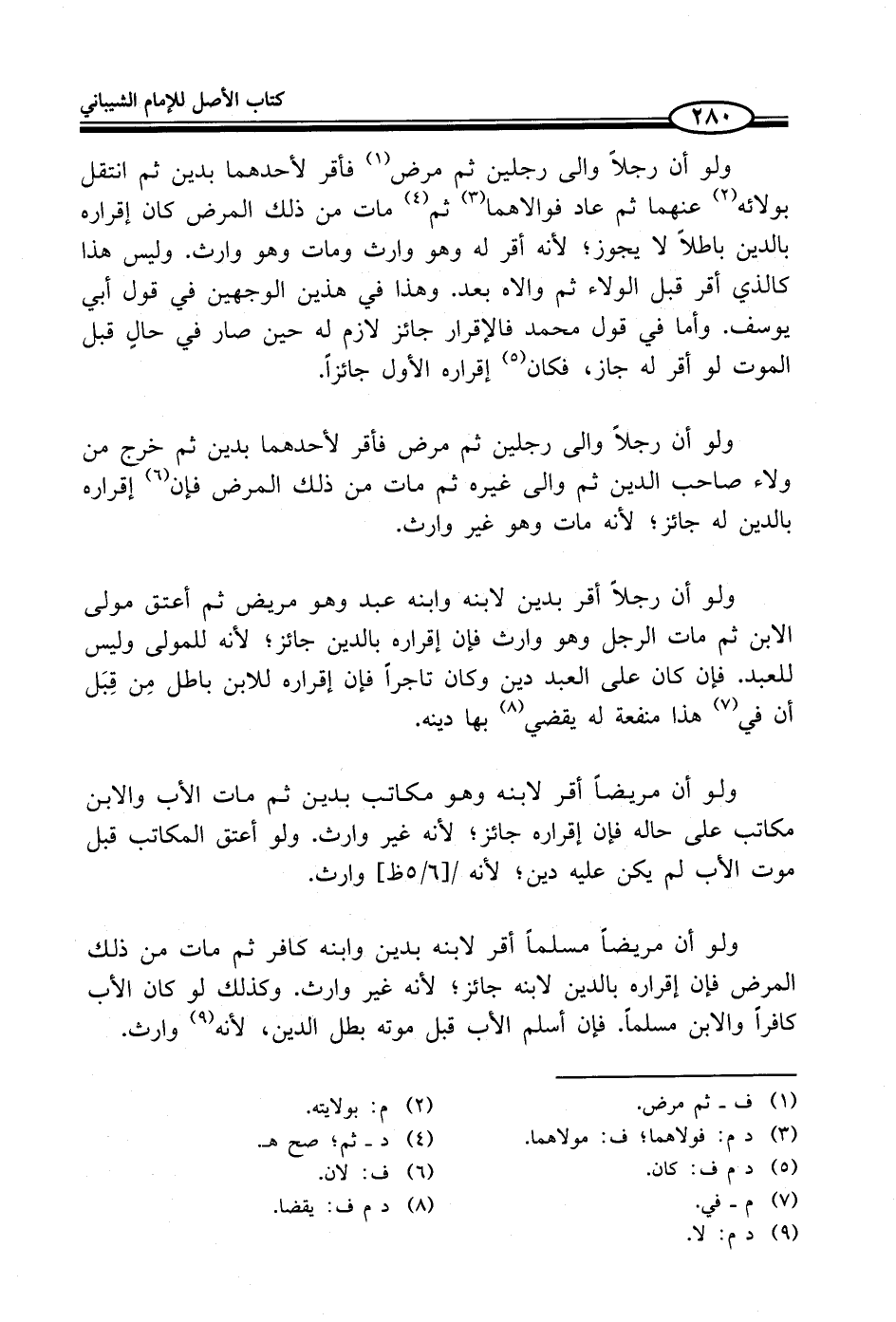 ولو أن رجلاً والى رجلين ثم مرض (¬1) فأقر لأحدهما بدين ثم انتقل بولائه (¬2) عنهما ثم عاد فوالاهما (¬3) ثم (¬4) مات من ذلك المرض كان إقراره بالدين باطلاً لا يجوز؛ لأنه أقر له وهو وارث ومات وهو وارث. وليس هذا كالذي أقر قبل الولاء ثم والاه بعد. وهذا في هذين الوجهين في قول أبي يوسف. وأما في قول محمد فالإقرار جائز لازم له حين صار في حالٍ قبل الموت لو أقر له جاز، فكان (¬5) إقراره الأول جائزاً.