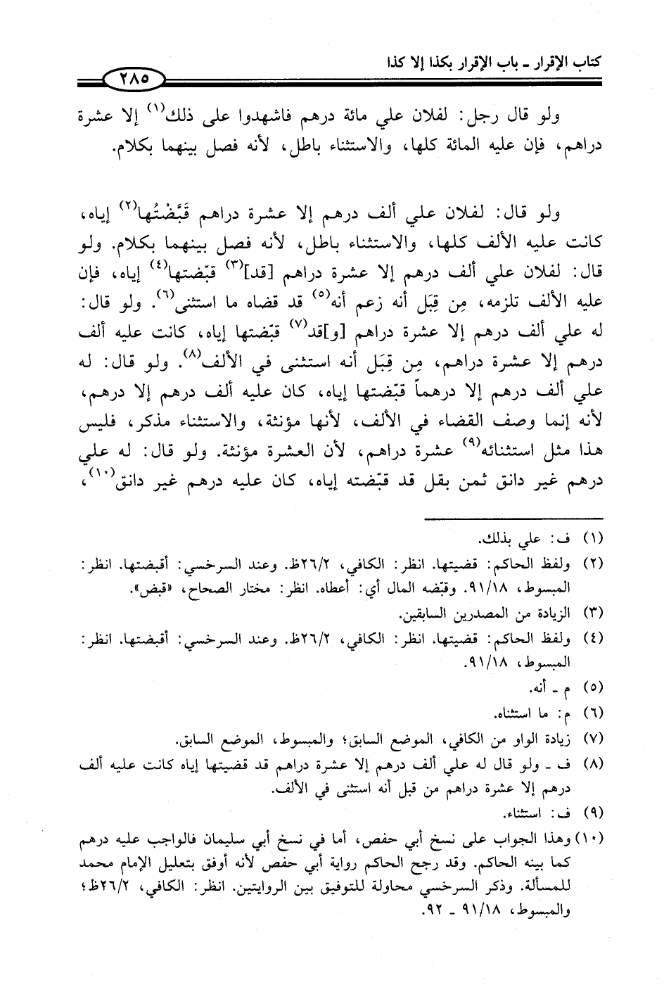 (¬8) ف - ولو قالماله علي ألف درهم إلا عشرة دراهم قد قضيتها إياه كانت عليه ألف درهم إلا عشرة دراهم من قبل أنه استثنى في الألف.
