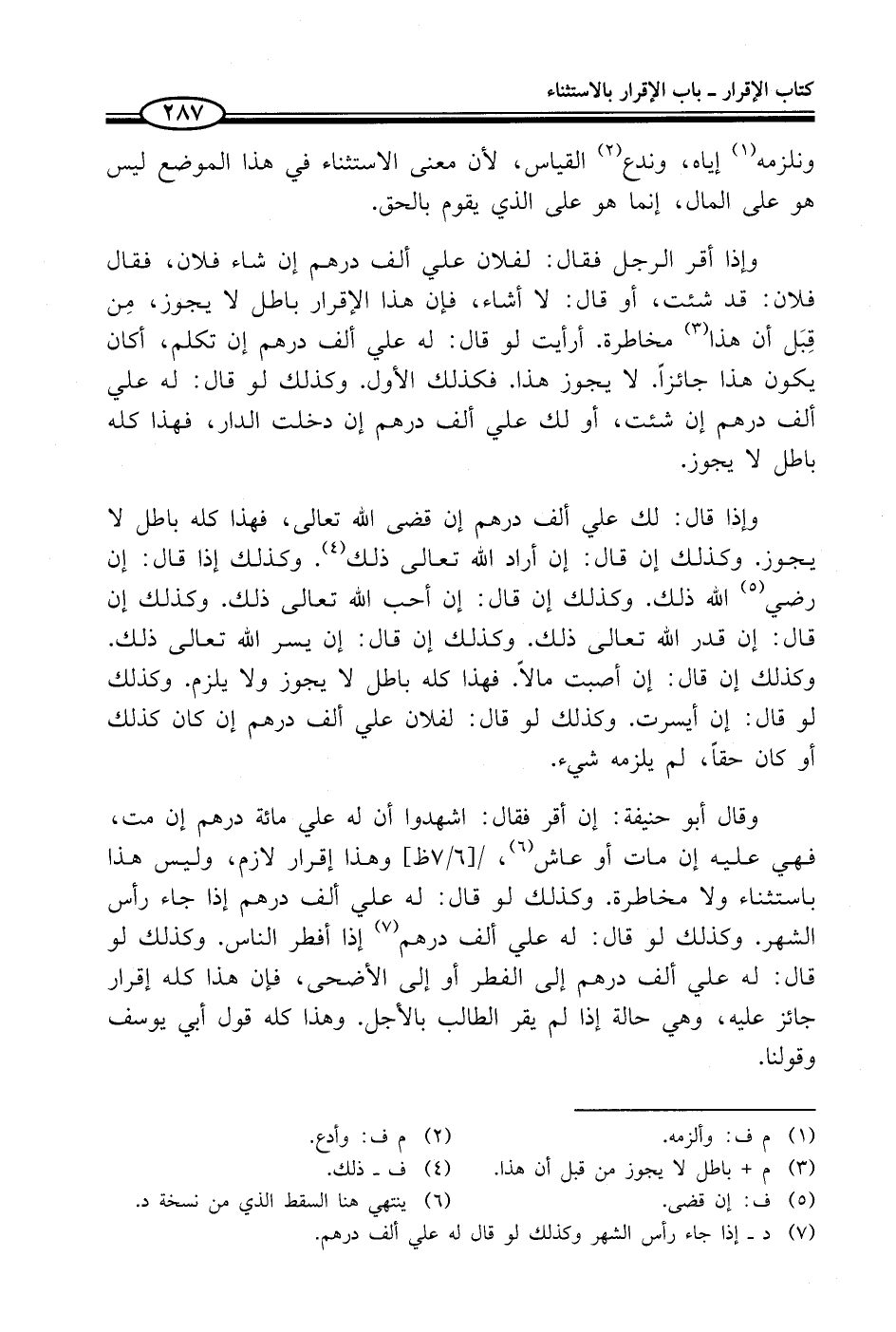 وقال أبو حنيفة: إن أقر فقال: اشهدوا أن له علي مائة درهم إن مت، فهي عليه إن مات أو عاش (¬6)، وهذا إقرار لازم، وليس هذا باستثناء ولا مخاطرة. وكذلك لو قال: له علي ألف درهم إذا جاء رأس الشهر. وكذلك لو قال: له علي ألف درهم (¬7) إذا أفطر الناس. وكذلك لو قال: له علي ألف درهم إلى الفطر أو إلى الأضحى، فإن هذا كله إقرار جائز عليه، وهي حالة إذا لم يقر الطالب بالأجل. وهذا كله قول أبي يوسف وقولنا.