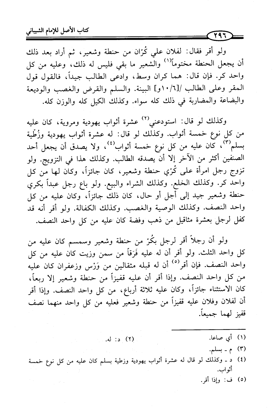 وكذلك لو قال: استودعني (¬2) عشرة أثواب يهودية ومروية، كان عليه من كل نوع خمسة أثواب. وكذلك لو قال: له عشرة أثواب يهودية وزُطّية بسلم (¬3)، كان عليه من كل نوع خمسة أثواب (¬4)، ولا يصدق أن يجعل أحد الصنفين أكثر من الآخر إلا أن يصدقه الطالب. وكذلك هذا في التزويج. ولو تزوج رجل امرأة على كُرّي حنطة وشعير، كان جائزاً، وكان لها من كل واحد كر. وكذلك الخلع. وكذلك الشراء والبيع. ولو باع رجل عبداً بكري حنطة وشعير جيد إلى أجل أو حال، كان ذلك جائزاً، وكان عليه من كل واحد النصف. وكذلك الوصية والغصب. وكذلك الكفالة. ولو أقر أنه قد كفل لرجل بعشرة مثاقيل من ذهب وفضة كان عليه من كل واحد النصف.