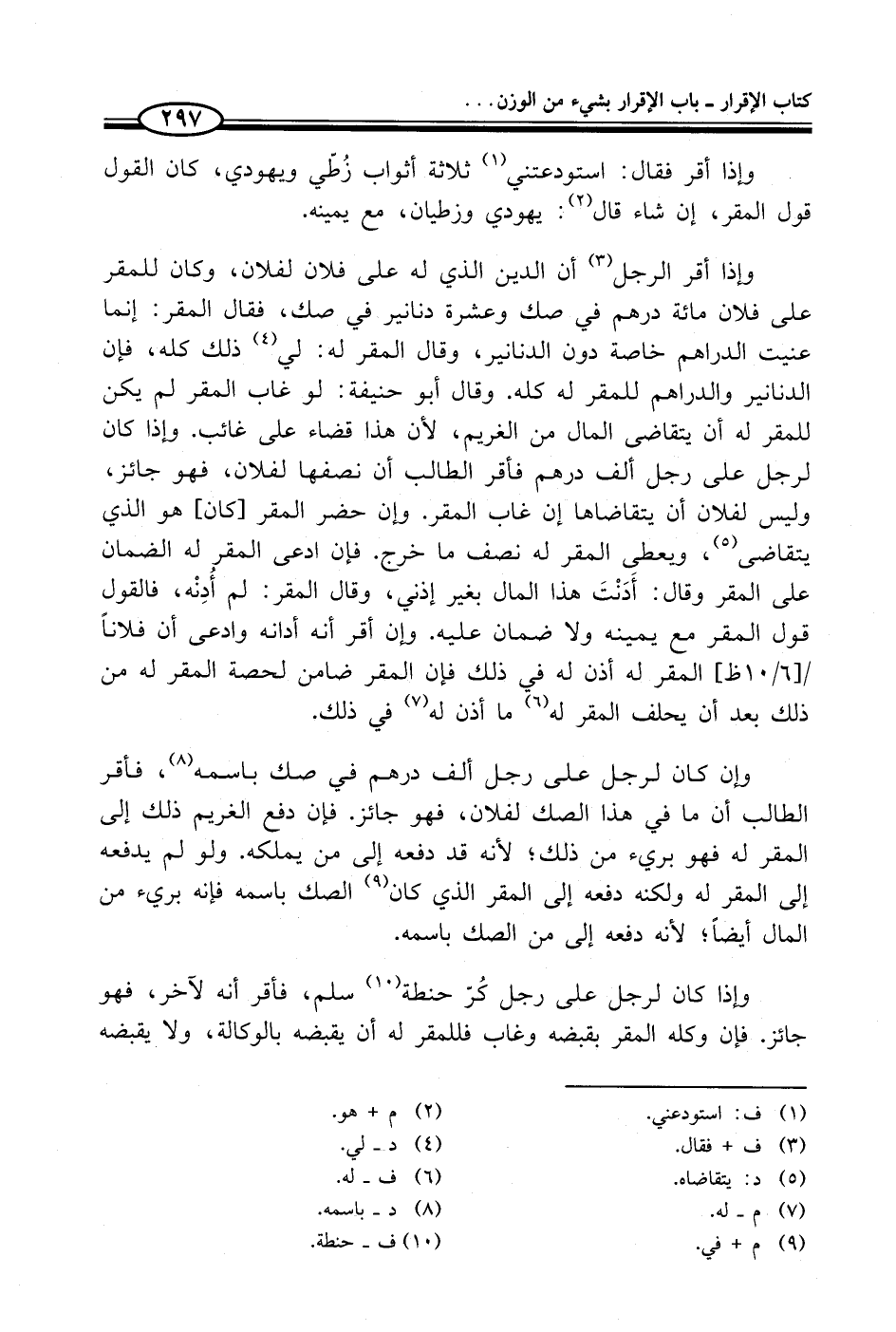 وإذا أقر الرجل (¬3) أن الدين الذي له على فلان لفلان، وكان للمقر على فلان مائة درهم في صك وعشرة دنانير في صك، فقال المقر: إنما عنيت الدراهم خاصة دون الدنانير، وقال المقر له: في (¬4) ذلك كله، فإن الدنانير والدراهم للمقر له كله. وقال أبو حنيفة: لو غاب المقر لم يكن للمقر له أن يتقاضى المال من الغريم، لأن هذا قضاء على غائب. وإذا كان لرجل على رجل ألف درهم فأقر الطالب أن نصفها لفلان، فهو جائز، وليس لفلان أن يتقاضاها إن غاب المقر. كان حضر المقر [كان] هو الذي يتقاضى (¬5)، ويعطى المقر له نصف ما خرج. فإن ادعى المقر له الضمان على المقر وقال: أَدَنْتَ هذا المال بغير إذني، وقال المقر: لم أُدِنْه، فالقول قول المقر مع يمينه ولا ضمان عليه. وإن أقر أنه أدانه وادعى أن فلاناً المقر له أذن له في ذلك فإن المقر ضامن لحصة المقر له من ذلك بعد أن يحلف المقر له (¬6) ما أذن له (¬7) في ذلك.