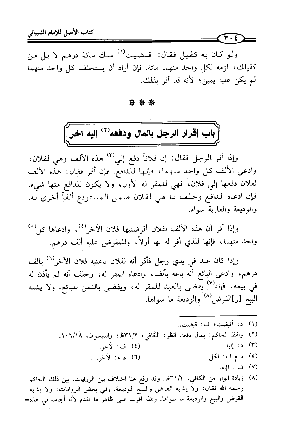 (¬8) زيادة الواو من الكافي، 2/ 31 ظ. وقد وقع هنا اختلاف بين الروايات. بين ذلك الحاكم -رحمه الله- فقال: ولا يثبه القرض والبيع الوديعة. وفي بعض الروايات: ولا يشبه القرض والبيع والوديعة ما سواها. وهذا أقرب على ظاهر ما تقدم لأنه أجاب في هذه=