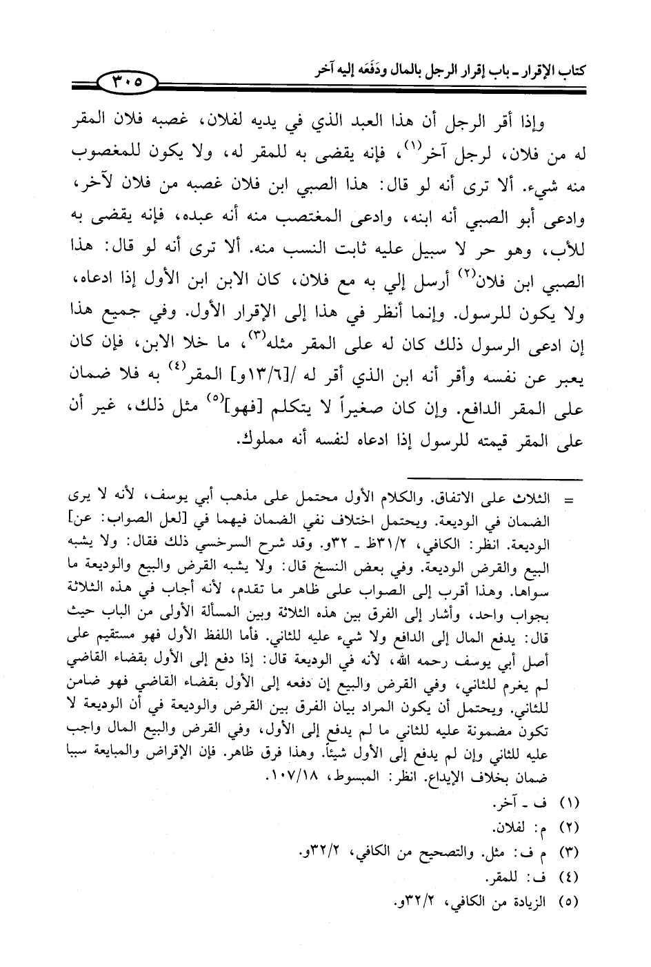 = الثلاث على الاتفاق. والكلام الأول محتمل على مذهب أبي يوسف، لأنه لا يرى الضمان في الوديعة. ويحتمل اختلاف نفي الضمان فيهما في [لعل الصواب: عن] الوديعة. انظر: الكافي، 2/ 31 ظ - 32 و. وقد شرح السرخسي ذلك فقال: ولا يشبه البيع والقرض الوديعة. وفي بعض النسخ قال: ولا يشبه القرض والبيع والوديعة ما سواها. وهذا أقرب إلى الصواب على ظاهر ما تقدم، لأنه أجاب في هذه الثلاثة بجواب واحد، وأشار إلى الفرق بين هذه الثلاثة وبين المسألة الأولى من الباب حيث قال: يدفع المال إلى الدافع ولا شيء عليه للثاني. فأما اللفظ الأول فهو مستقيم على أصل أبي يوسف -رحمه الله-، لأنه في الوديعة قال: إذا دفع إلى الأول بقضاء القاضي لم يغرم للثاني، وفي القرض والبيع إن دفعه إلى الأول بقضاء القاضي فهو ضامن للئاني. ويحتمل أن يكون المراد بيان الفرق بين القرض والوديعة في أن الوديعة لا تكون مضمونة عليه للثاني ما لم يدفع إلى الأول، وفي القرض والبيع المال واجب عليه للثاني كان لم يدفع إلى الأول شيئاً. وهذا فرق ظاهر. فإن الإقراض والمبايعة سببا ضمان بخلاف الإيداع. انظر: المبسوط، 18/ 107.
