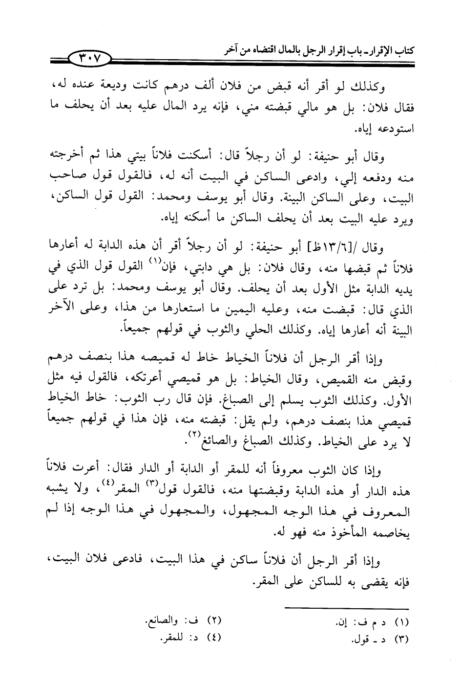 وإذا أقر الرجل أن فلاناً الخياط خاط له قميصه هذا بنصف درهم وقبض منه القميص، وقال الخياط: بل هو قميصي أعرتكه، فالقول فيه مثل الأول. وكذلك الثوب يسلم إلى الصباغ. فإن قال رب الثوب: خاط الخياط قميصي هذا بنصف درهم، ولم يقل: قبضته منه، فإن هذا في قولهم جميعاً لا يرد على الخياط. وكذلك الصباغ والصائغ (¬2).