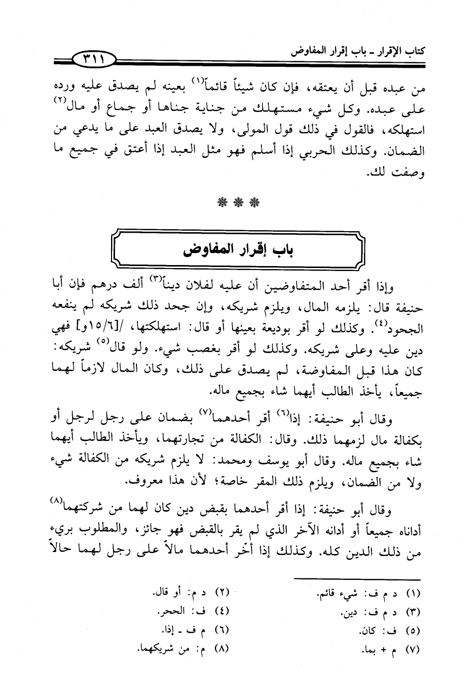 وإذا أقر أحد المتفاوضين أن عليه لفلان ديناً (¬3) ألف درهم فإن أبا حنيفة قال: يلزمه المال، ويلزم شريكه، وإن جحد ذلك شريكه لم ينفعه الجحود (¬4). وكذلك لو أقر بوديعة بعينها أو قال: استهلكتها، فهي دين عليه وعلى شريكه. وكذلك لو أقر بغصب شيء. ولو قال (¬5) شريكه: كان هذا قبل المفاوضة، لم يصدق على ذلك، وكان المال لازماً لهما جميعاً، يأخذ الطالب أيهما شاء بجميع ماله.