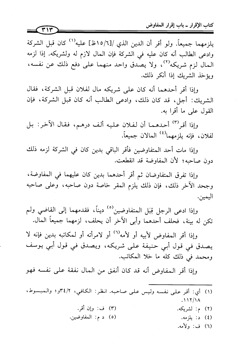 وإذا أقر المفاوض لأبيه أو لأمه (¬6) أو لامرأته أو لمكاتبه بدين فإنه لا يصدق في قول أبي حنيفة على شريكه، ويصدق في قول أبي يوسف ومحمد في ذلك كله ما خلا المكاتب.