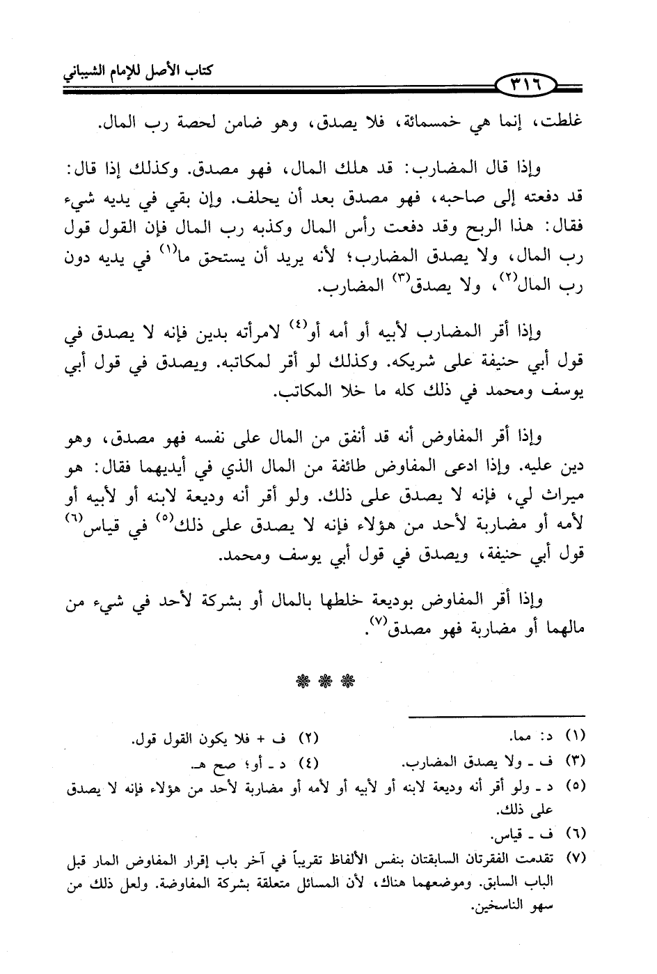 (¬7) تقدمت الفقرتان السابقتان بنفس الألفاظ تقريباً في آخر باب إقرار المفاوض المار قبل الباب السابق. وموضعهما هناك، لأن المسائل متعلقة بشركة المفاوضة ولعل ذلك من سهو الناسخين.