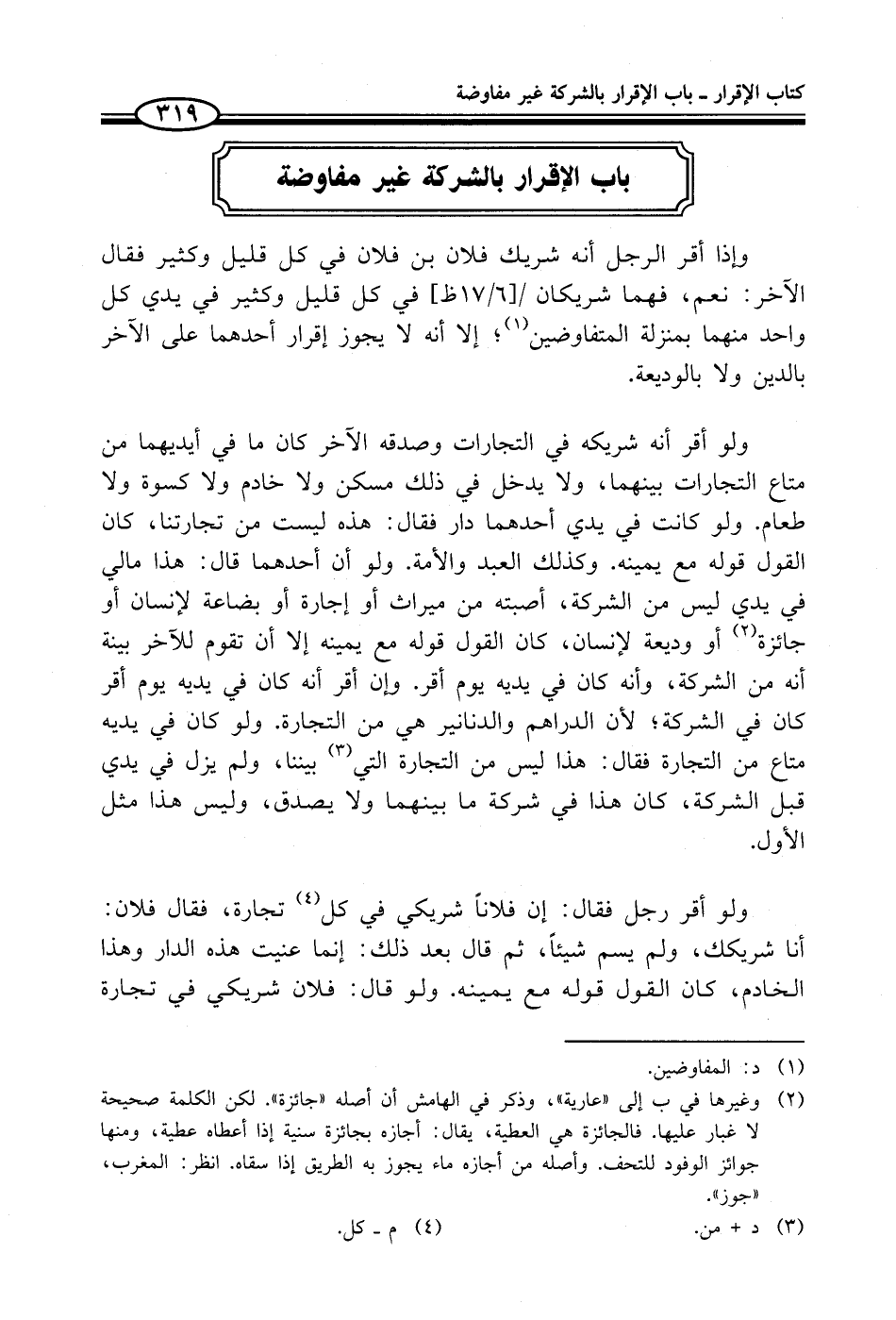 ولو أقر أنه شريكه في التجارات وصدقه الآخر كان ما في أيديهما من متاع التجارات بينهما، ولا يدخل في ذلك مسكن ولا خادم ولا كسوة ولا طعام. ولو كانت في يدي أحدهما دار فقال: هذه ليست من تجارتنا، كان القول قوله مع يمينه. وكذلك العبد والأمة. ولو أن أحدهما قال: هذا مالي في يدي ليس من الشركة، أصبته من ميراث أو إجارة أو بضاعة لإنسان أو جائز؛ (¬2) أو وديعة لإنسان، كان القول قوله مع يمينه إلا أن تقوم للآخر بينة أنه من الشركة، وأنه كان في يديه يوم أقر. وإن أقر أنه كان في يديه يوم أقر كان في الشركة؛ لأن الدراهم والدنانير هي من التجارة. ولو كان في يديه متاع من التجارة فقال: هذا ليس من التجارة التي (¬3) بيننا، ولم يزل في يدي قبل الشركة، كان هذا في شركة ما بينهما ولا يصدق، وليس هذا مثل الأول.