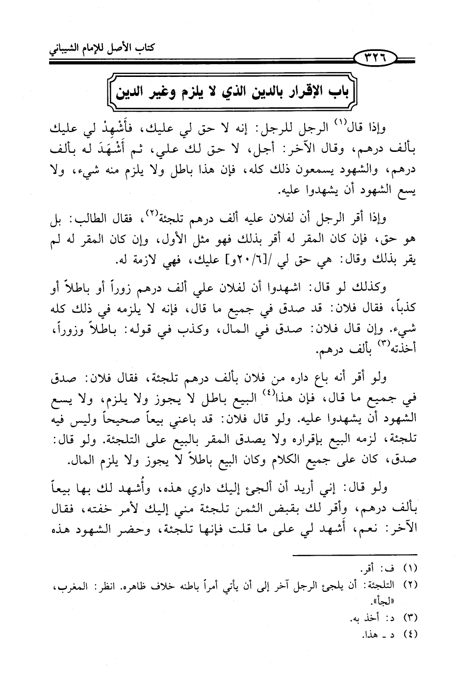 ولو قال: إني أريد أن ألجئ إليك داري هذه، وأُشهد لك بها بيعاً بألف درهم، وأقر لك بقبض الثمن تلجئة مني إليك لأمر خفته، فقال الآخر: نعم، أَشهد لي على ما قلت فإنها تلجئة، وحضر الشهود هذه