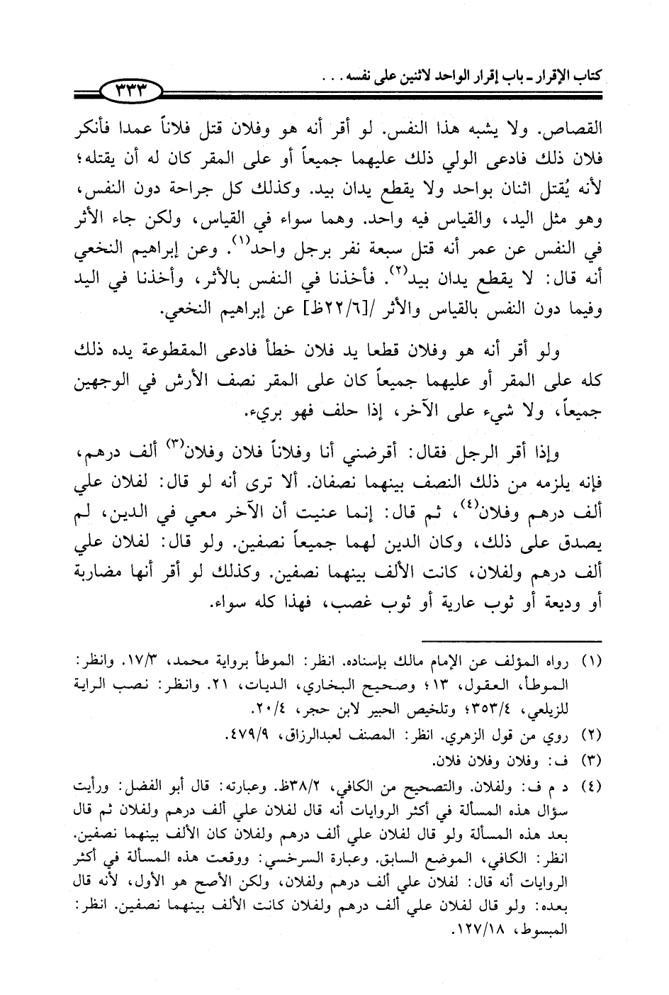 القصاص. ولا يشبه هذا النفس. لو أقر أنه هو وفلان قتل فلاناً عمدا فأنكر فلان ذلك فادعى الولي ذلك عليهما جميعاً أو على المقر كان له أن يقتله؛ لأنه يُقتل اثنان بواحد ولا يقطع يدان بيد. وكذلك كل جراحة دون النفس، وهو مثل اليد، والقياس فيه واحد. وهما سواء في القياس، ولكن جاء الأثر في النفس عن عمر أنه قتل سبعة نفر برجل واحد (¬1). وعن إبراهيم النخعي أنه قال: لا يقطع يدان بيد (¬2). فأخذنا في النفس بالأثر، وأخذنا في اليد وفيما دون النفس بالقياس والأثر عن إبراهيم النخعي.