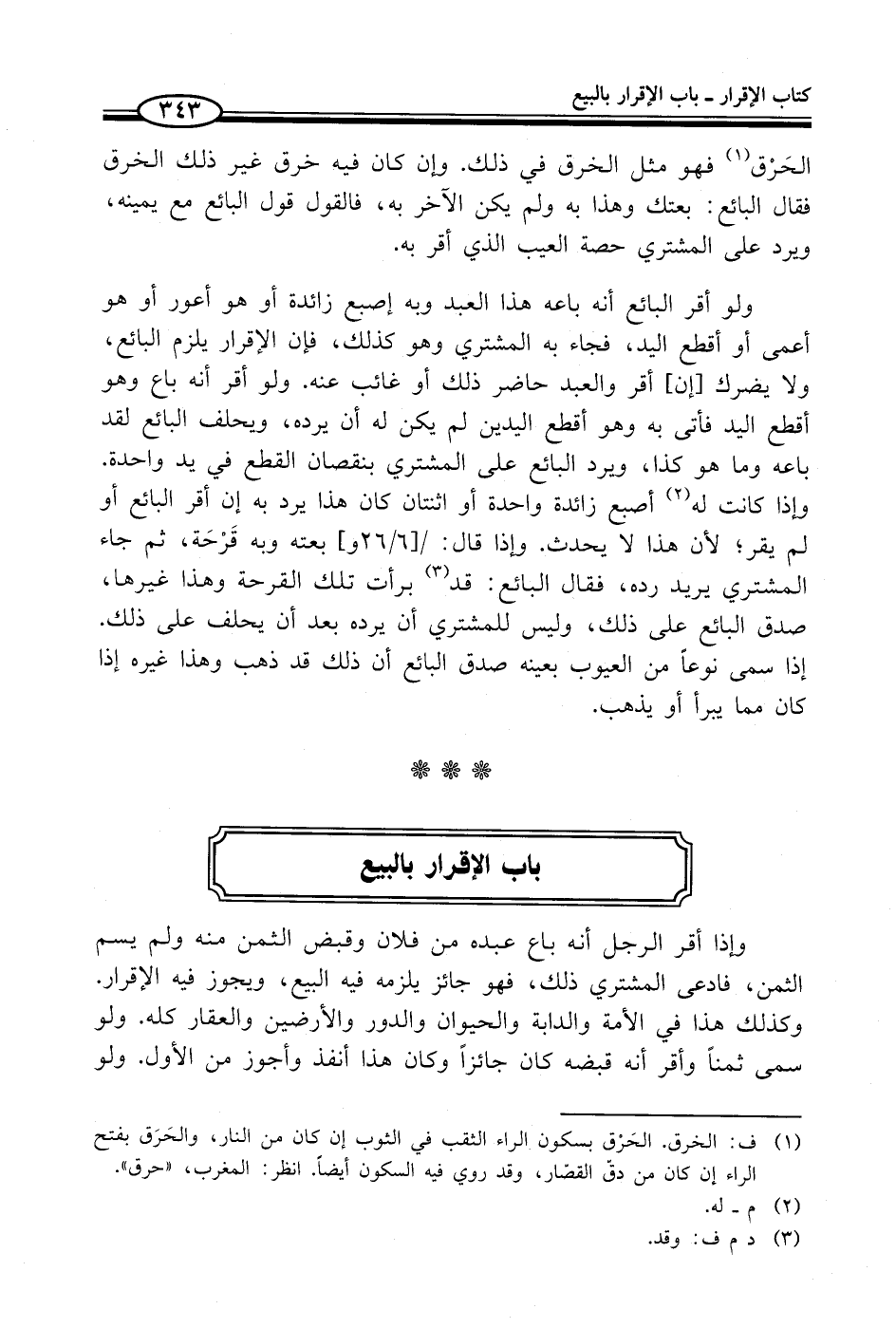 ولو أقر البائع أنه باعه هذا العبد وبه إصبع زائدة أو هو أعور أو هو أعمى أو أقطع اليد، فجاء به المشتري وهو كذلك، فإن الإقرار يلزم البائع، ولا يضرك [إن] أقر والعبد حاضر ذلك أو غائب عنه. ولو أقر أنه باع وهو أقطع اليد فأتى به وهو أقطع اليدين لم يكن له أن يرده، ويحلف البائع لقد باعه وما هو كذا، ويرد البائع على المشتري بنقصان القطع في يد واحدة. وإذا كانت له (¬2) أصبع زائدة واحدة أو اثنتان كان هذا يرد به إن أقر البائع أو لم يقر؛ لأن هذا لا يحدث. وإذا قال: بعته وبه قَرْحَة، ثم جاء المشتري يريد رده، فقال البائع: قد (¬3) برأت تلك القوحة وهذا غيرها، صدق البائع على ذلك، وليس للمشتري أن يرده بعد أن يحلف على ذلك. إذا سمى نوعاً من العيوب بعينه صدق البائع أن ذلك قد ذهب وهذا غيره إذا كان مما يبرأ أو يذهب.
