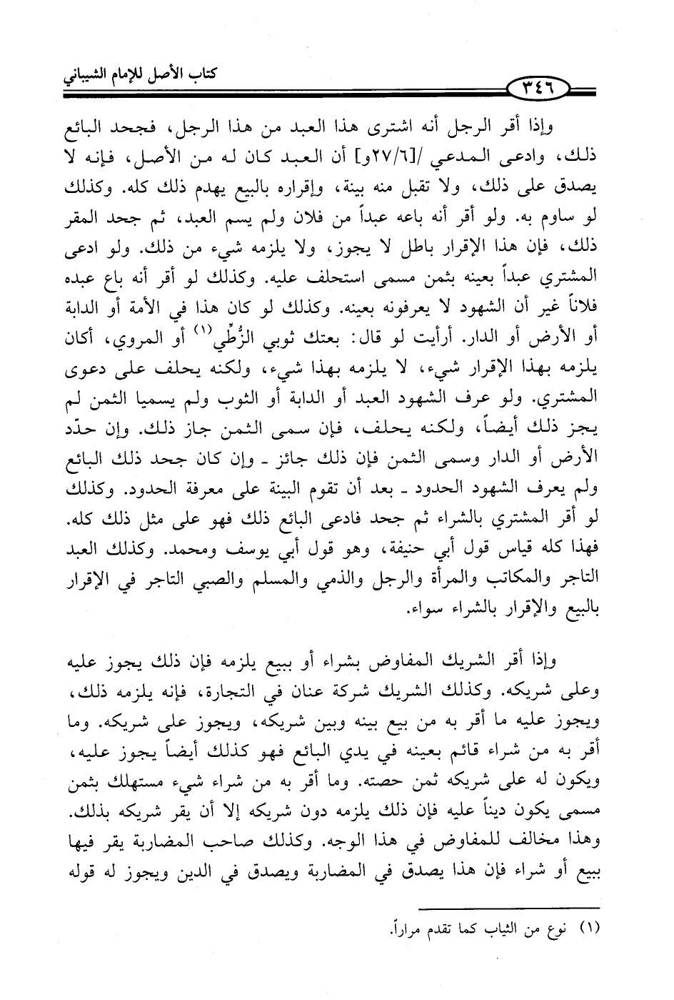 وإذا أقر الرجل أنه اشترى هذا العبد من هذا الرجل، فجحد البائع ذلك، وادعى المدعي أن العبد كان له من الأصل، فإنه لا يصدق على ذلك، ولا تقبل منه بينة، وإقراره بالبيع يهدم ذلك كله. وكذلك لو ساوم به. ولو أقر أنه باعه عبداً من فلان ولم يسم العبد، ثم جحد المقر ذلك، فإن هذا الإقرار باطل لا يجوز، ولا يلزمه شيء من ذلك. ولو ادعى المشتري عبداً بعينه بثمن مسمى استحلف عليه. وكذلك لو أقر أنه باع عبده فلاناً غير أن الشهود لا يعرفونه بعينه. وكذلك لو كان هذا في الأمة أو الدابة أو الأرض أو الدار. أرأيت لو قال: بعتك ثوبي الزّطِّي (¬1) أو المروي، أكان يلزمه بهذا الإقرار شيء، لا يلزمه بهذا شيء، ولكنه يحلف على دعوى المشتري. ولو عرف الشهود العبد أو الدابة أو الثوب ولم يسميا الثمن لم يجز ذلك أيضاً، ولكنه يحلف، فإن سمى الثمن جاز ذلك. وإن حدّد الأرض أو الدار وسمى الثمن فإن ذلك جائز - وإن كان جحد ذلك البائع ولم يعرف الشهود الحدود - بعد أن تقوم البينة على معرفة الحدود. وكذلك لو أقر المشتري بالشراء ثم جحد فادعى البائع ذلك فهو على مثل ذلك كله. فهذا كله قياس قول أبي حنيفة، وهو قول أبي يوسف ومحمد. وكذلك العبد التاجر والمكاتب والمرأة والرجل والذمي والمسلم والصبي التاجر في الإقرار بالبيع والإقرار بالشراء سواء.