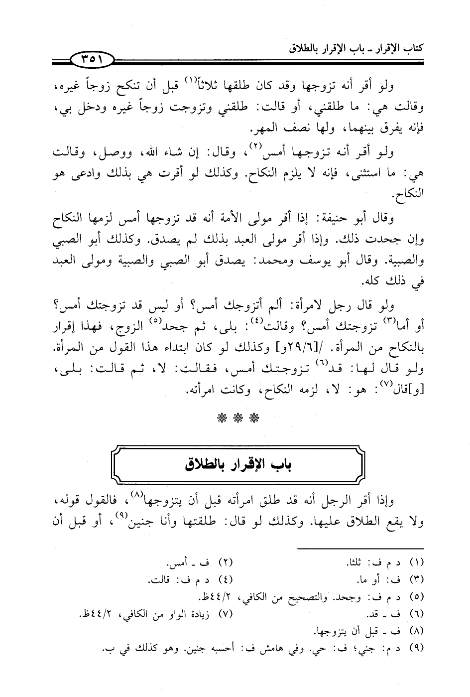 وإذا أقر الرجل أنه قد طلق امرأته قبل أن يتزوجها (¬8) , فالقول قوله ولا يقع الطلاق عليها. وكذلك لو قال: طلقتها وأنا جنين (¬9) , أو قبل أن