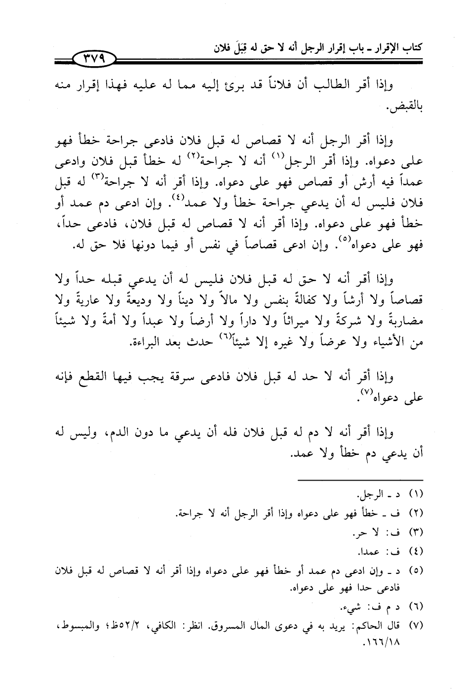 (¬7) قال الحاكم: يريد به في دعوى المال المسروق. انظر: الكافي، 2/ 52 ظ؛ والمبسوط، 18/ 166.