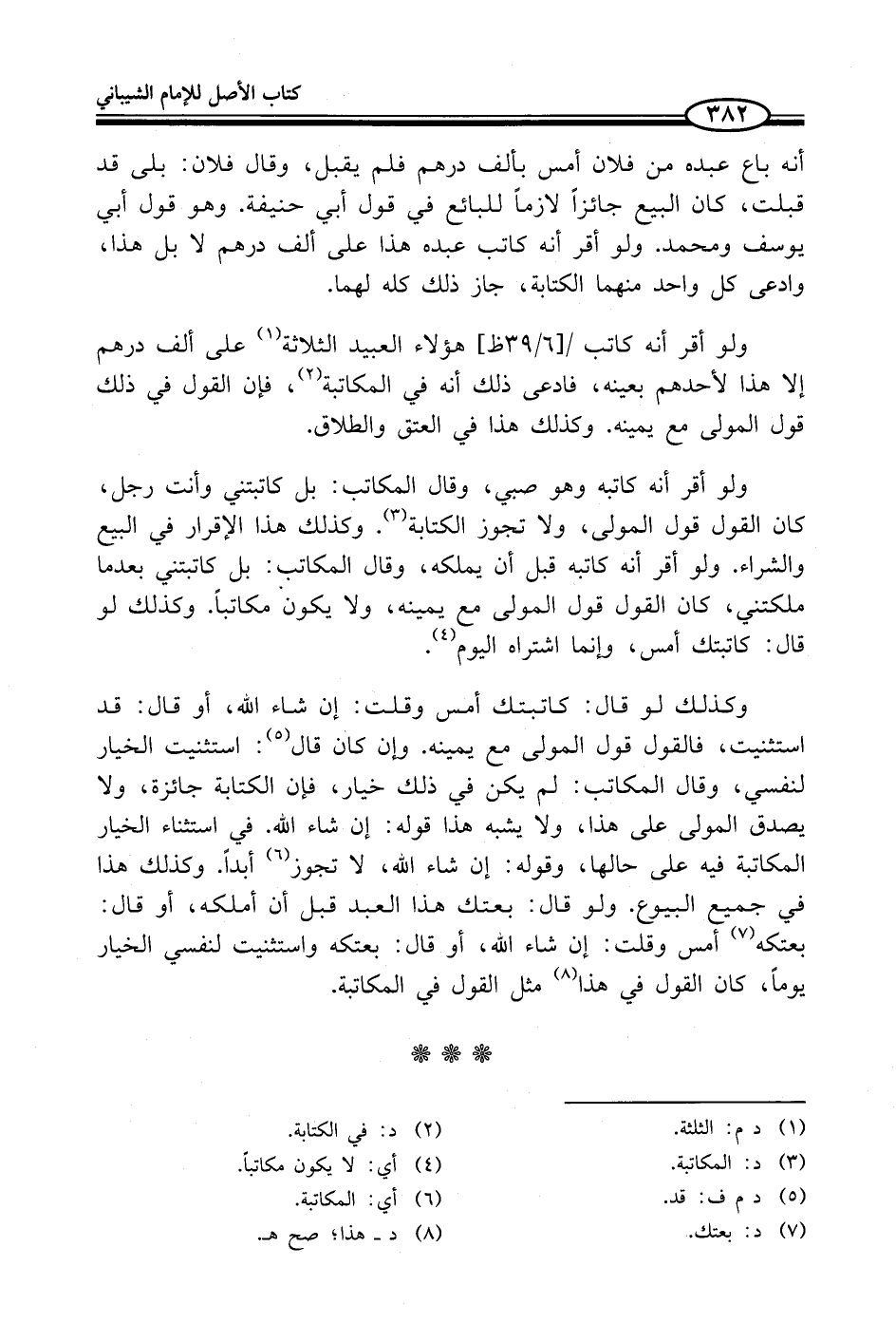 وكذلك لو قال: كاتبتك أمس وقلت: إن شاء الله، أو قال: قد استثنيت، فالقول قول المولى مع يمينه. وإن كان قال (¬5): استثنيت الخيار لنفسي، وقال المكاتب: لم يكن في ذلك خيار، فإن الكتابة جائزة، ولا يصدق المولى على هذا، ولا يشبه هذا قوله: إن شاء الله. في استثناء الخيار المكاتبة فيه على حالها، وقوله: إن شاء الله، لا تجوز (¬6) أبداً. وكذلك هذا في جميع البيوع. ولو قال: بعتك هذا العبد قبل أن أملكه، أو قال: بعتكه (¬7) أمس وقلت: إن شاء الله، أو قال: بعتكه وأستثنيت لنفسي الخيار يوماً، كان القول في هذا (¬8) مثل القول في المكاتبة.